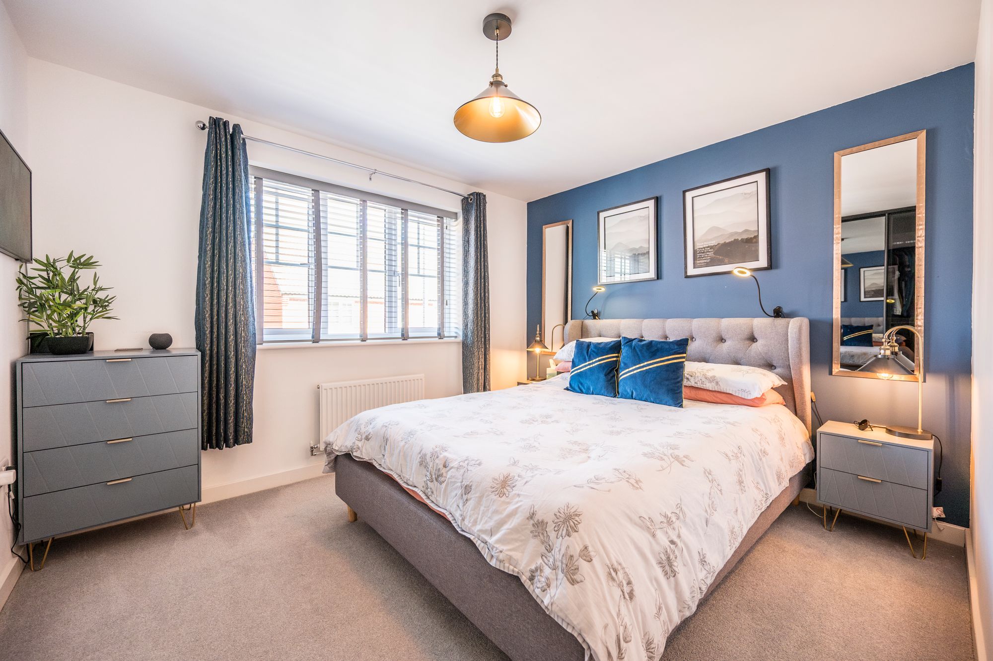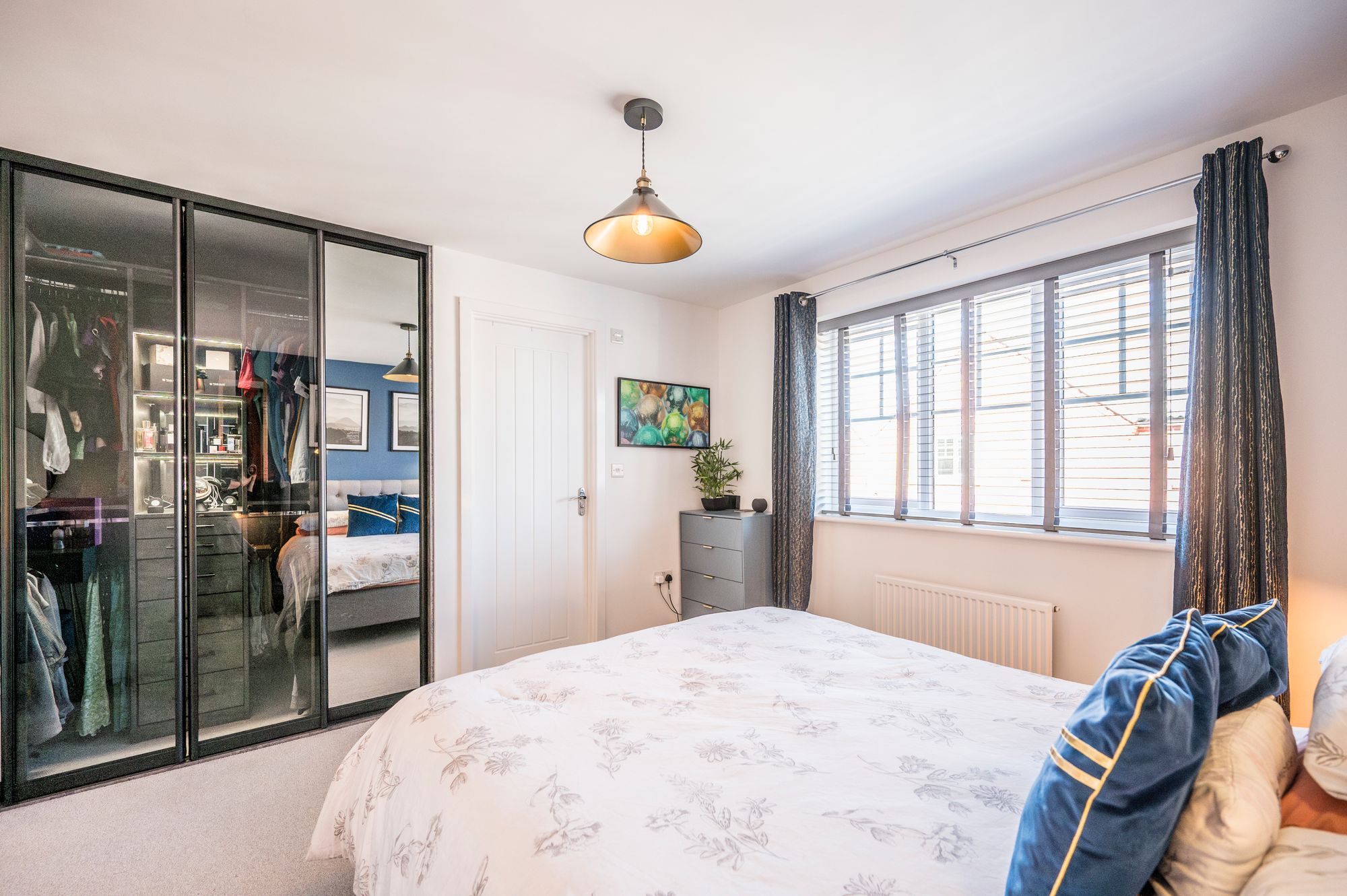 The principal bedroom is a spacious double room featuring a window to the front aspect that fills the room with natural light. It benefits from a custom built-in wardrobe with sliding doors, providing extensive hanging and shelving space without compromising floor area. A radiator ensures the room stays warm and cozy. This main bedroom also enjoys the luxury of an en-suite shower room for added convenience and privacy.
