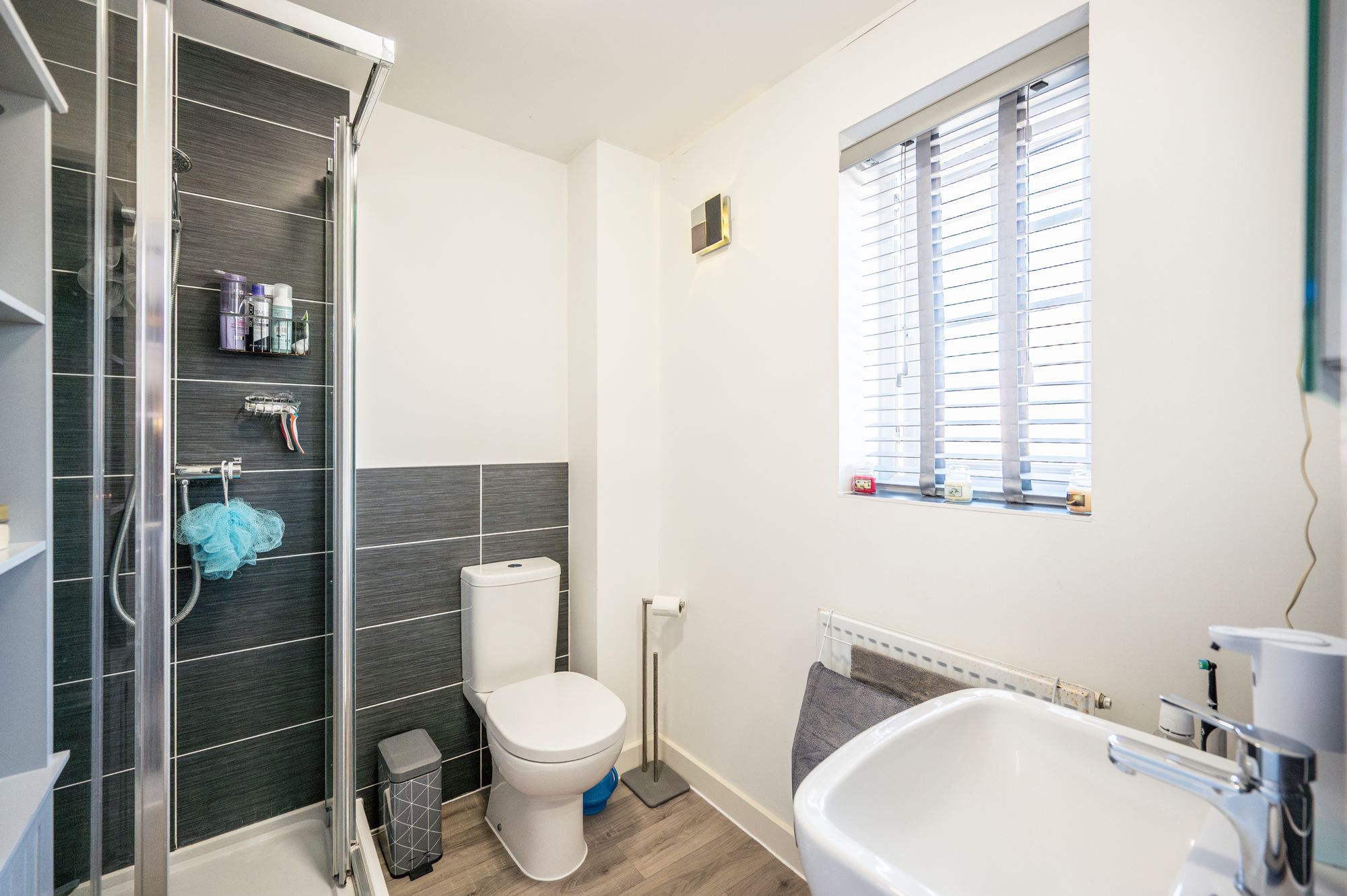 Serving the main bedroom, the en-suite is modern and well-appointed. It includes a corner shower cubicle with a mixer shower, allowing for refreshing morning routines. There is also a WC and a pedestal wash basin, all complemented by contemporary tiling and fixtures. A window to the front provides natural light and ventilation, while a radiator keeps the space comfortable.