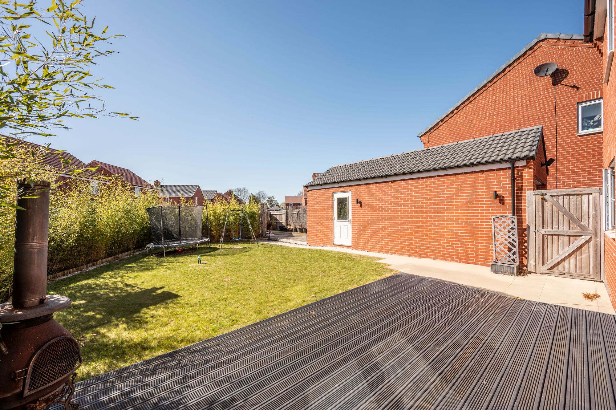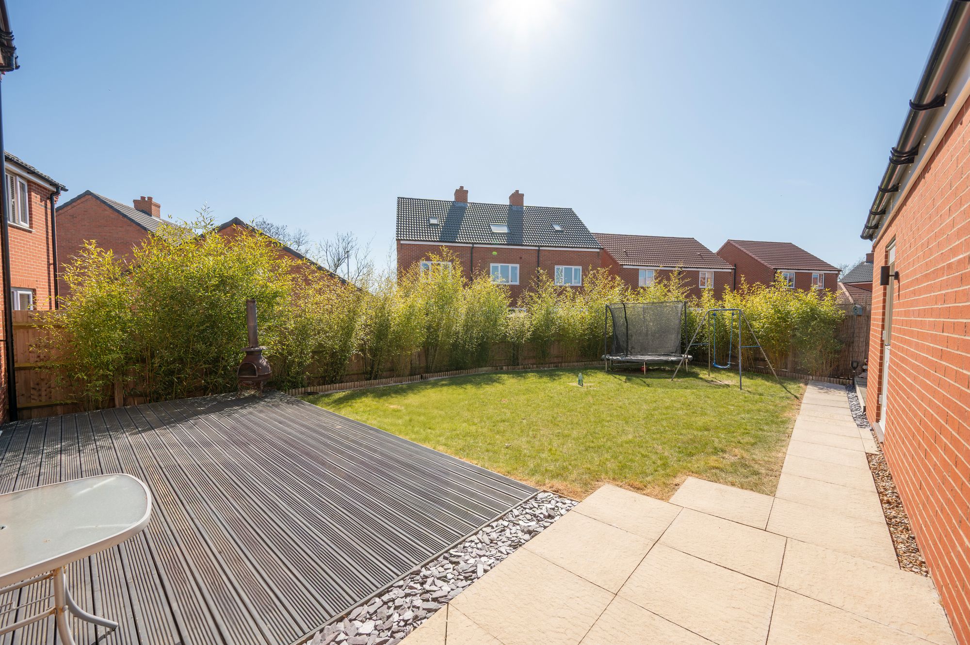 Outside, the rear garden is fully enclosed, offering a private and secure outdoor space for relaxation and play. The garden has been thoughtfully landscaped to include two decked seating areas-ideal for outdoor dining or entertaining-a neatly maintained lawn, and a patio-style walkway. Mature bamboo plantings line parts of the border, adding greenery and a sense of privacy. A personal door from the garden provides direct access to the large single garage, which offers excellent storage, an electric charging point and parking space. In front of the garage, there are two dedicated driveway parking spaces, providing ample off-road parking for residents and visitors.
