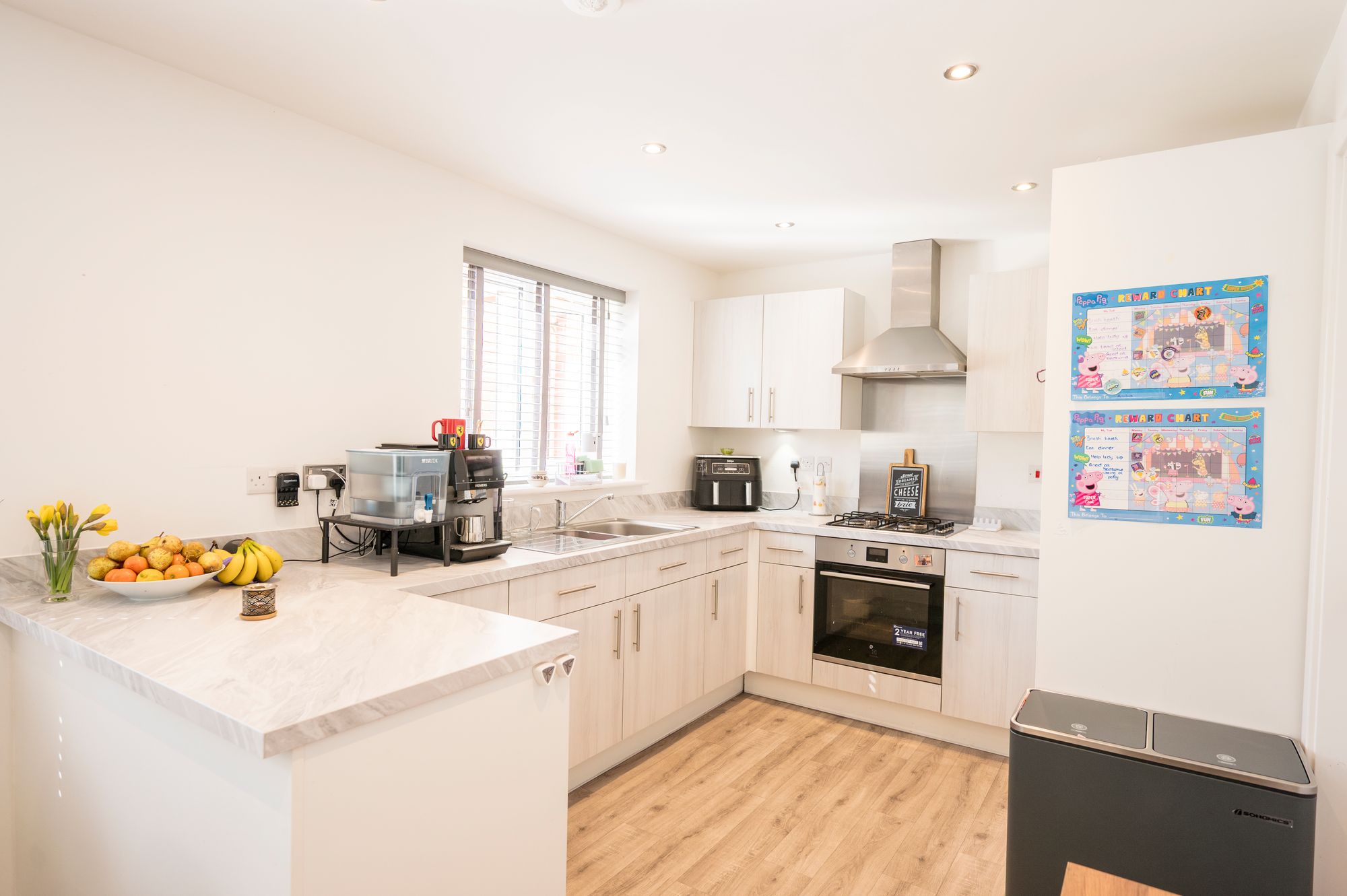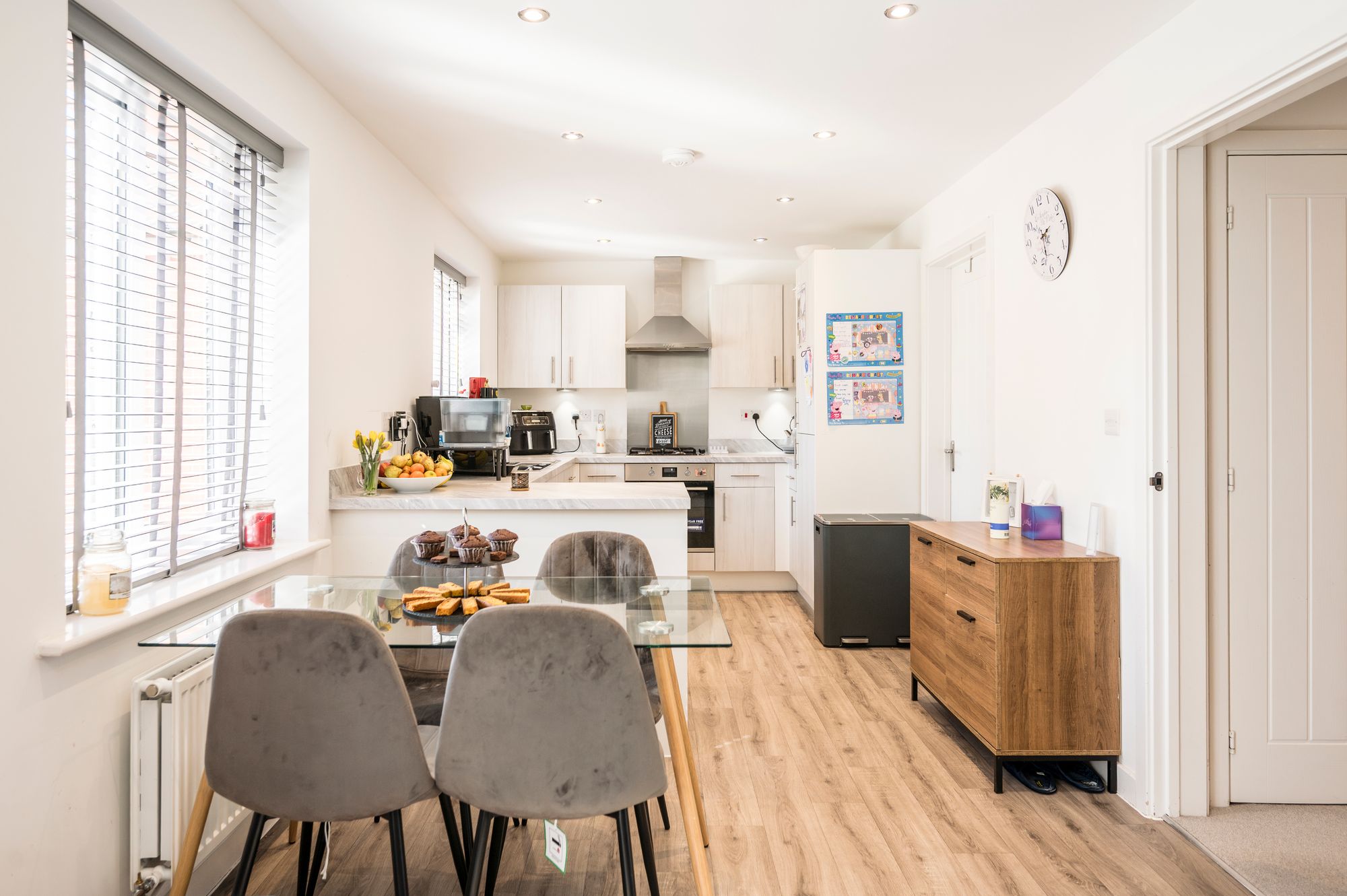 The heart of the home is the large open-plan kitchen and dining room, perfect for modern family living. The kitchen area is fitted with an extensive range of high and low level units complemented by rolled-edge work surfaces and matching upstands. It includes a stainless steel double drainer sink with a mixer tap, an electric oven with a gas hob, and integrated appliances including a fridge/freezer and a dishwasher. The adjoining dining area offers ample space for a family-sized table and enjoys an abundance of natural light, with two windows and double doors that open directly to the rear garden. Two radiators serve this expansive space, ensuring it remains cozy and inviting for meals and gatherings year-round.