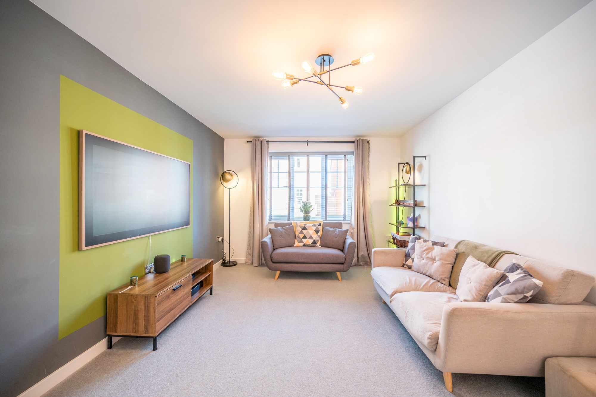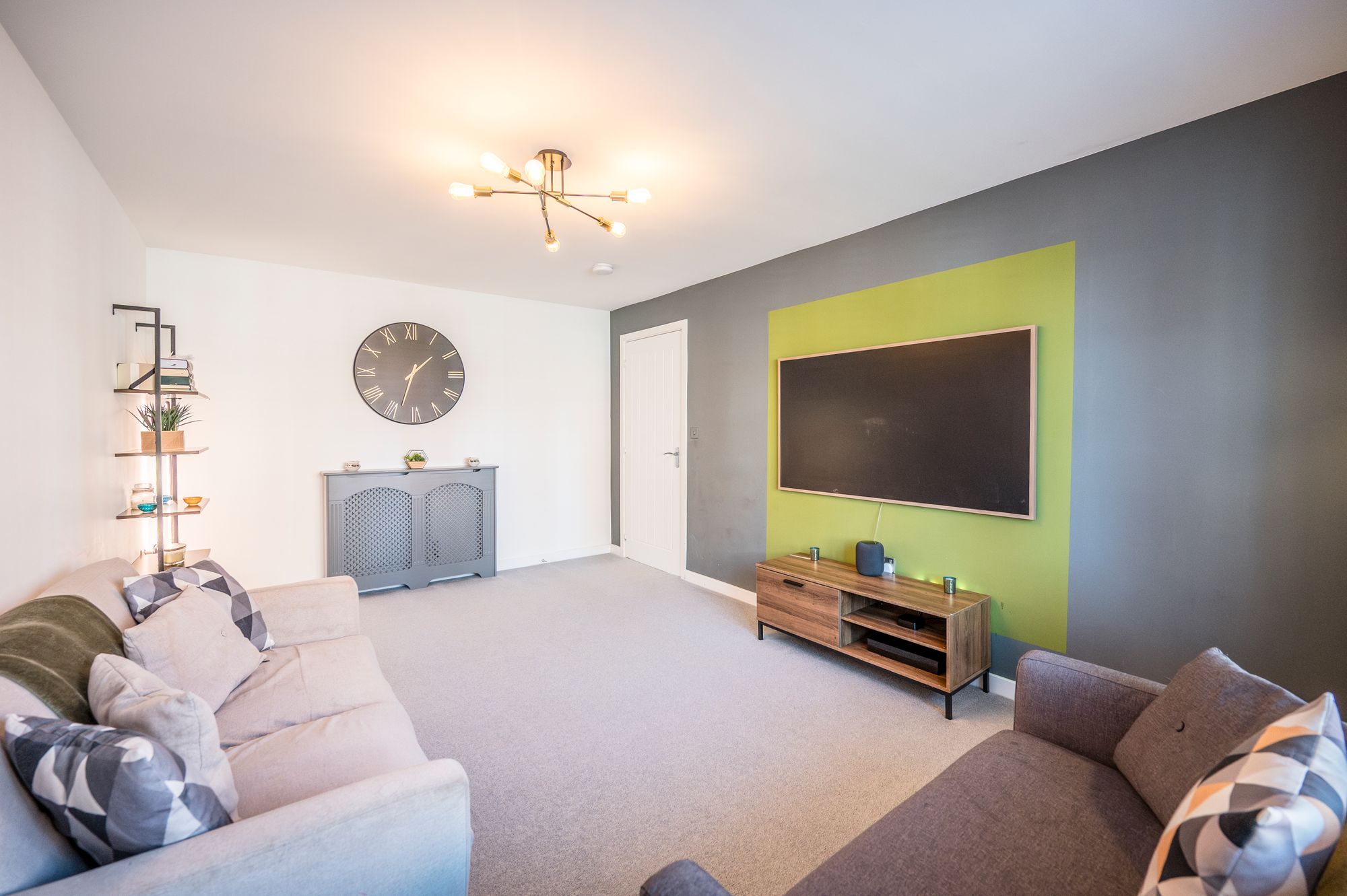 A generously sized living room with a window to the front aspect, allowing plenty of natural light to fill the space. This comfortable reception room is ideal for family relaxation or entertaining, and it features two radiators to ensure warmth throughout the year. The neutral decor and spacious layout provide a versatile environment for any style of furnishings.