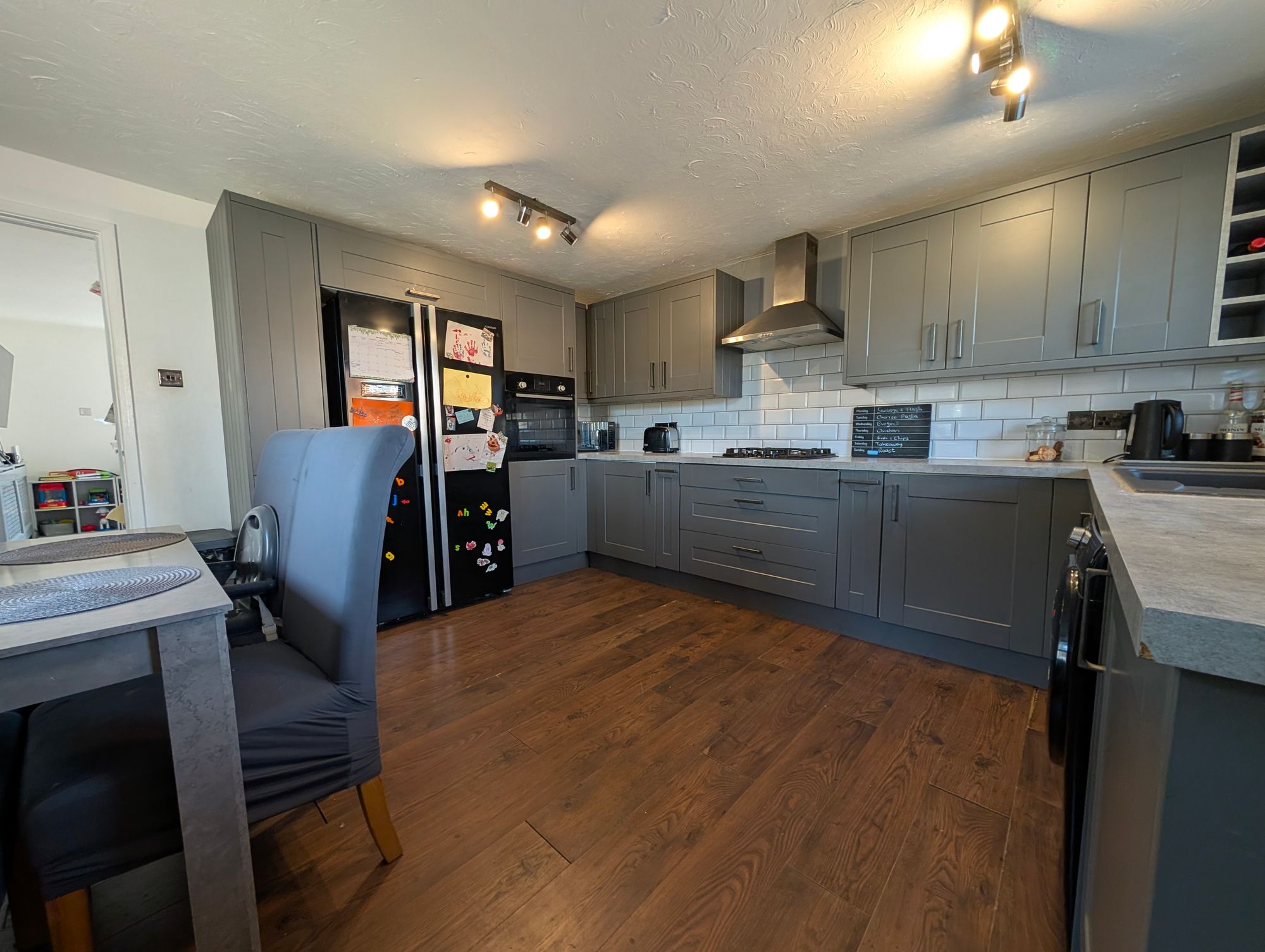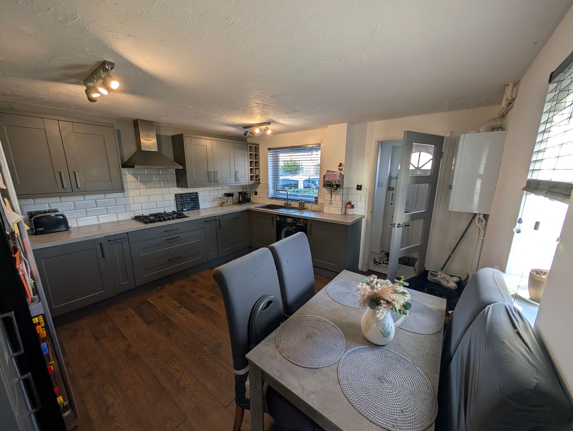 A bright and spacious kitchen/diner with windows to the front and side aspects. The kitchen is fitted with a range of high and low-level units with work surfaces and tiled splashbacks, along with a single drainer sink with mixer tap. Integrated appliances include a gas hob with extractor hood above and an electric oven. There is generous space for an American-style fridge/freezer and plumbing for a washing machine. Finished with wooden flooring and radiator, the room also offers space for a dining table.