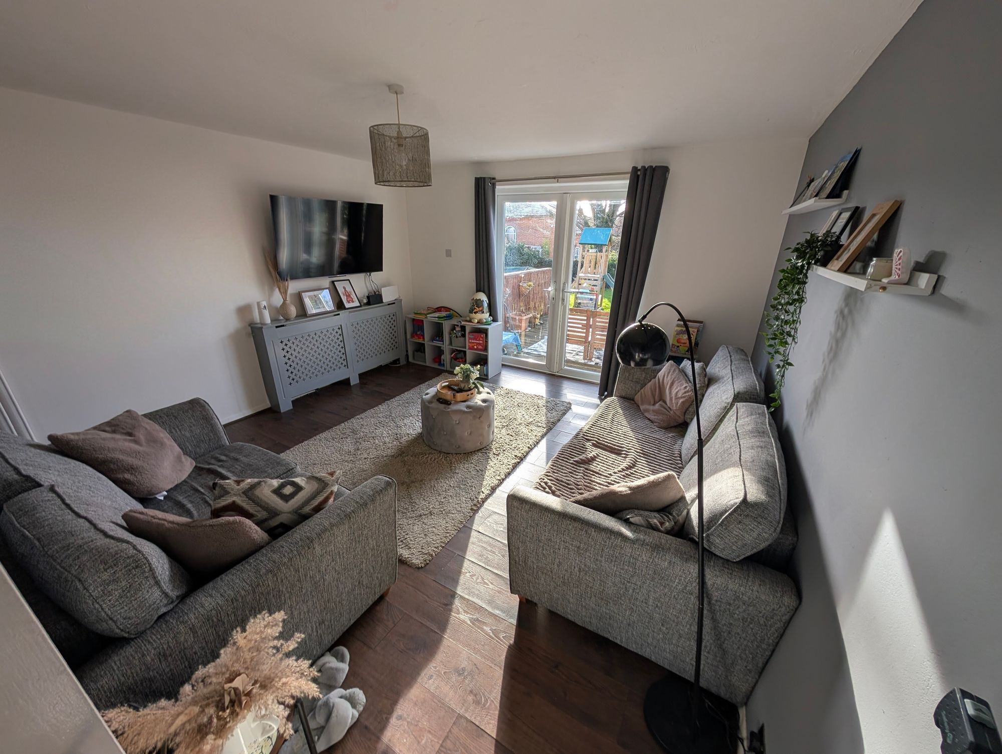 Positioned to the rear of the property, the living room features a radiator, a useful understairs storage cupboard, and double doors opening directly onto the rear garden, creating a light and inviting space.