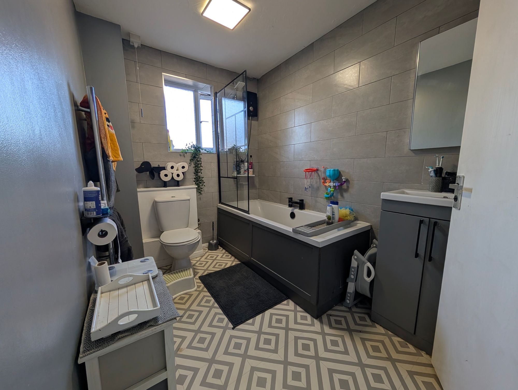 Modern and well-appointed, comprising a deep panelled bath with overhead electric shower, WC, wash hand basin with storage beneath, partially tiled walls, and tile-effect flooring.
