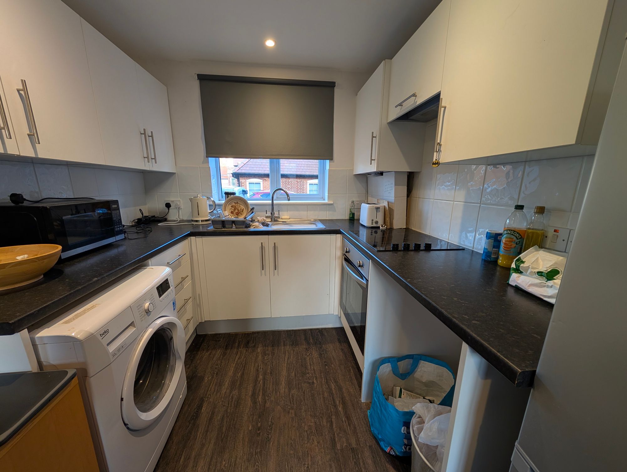 The kitchen area is positioned to the front and fitted with a range of high and low-level units with roll-edge work surfaces and tiled splashbacks. Appliances include an integrated electric oven and hob with extractor, along with space for a washing machine, dishwasher, and tall fridge/freezer. A single drainer sink with mixer tap sits beneath the front-facing window. A newly fitted wall-mounted gas combi boiler completes the kitchen.