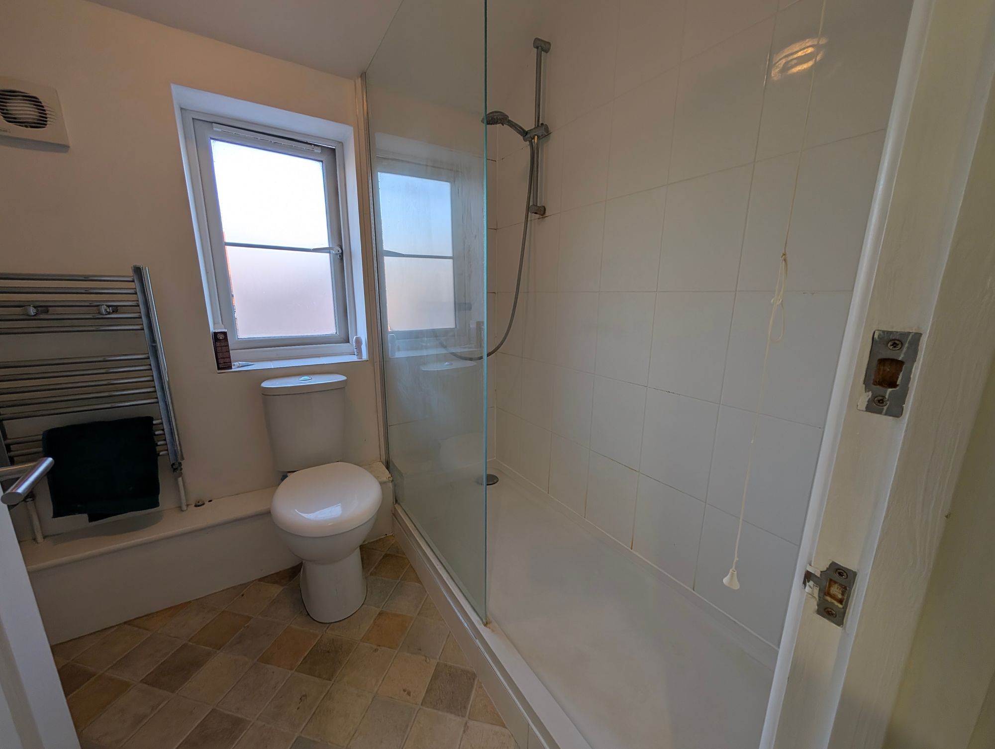 Modern and well-appointed, comprising a large walk-in shower cubicle with mixer shower and tiled surround, WC, pedestal wash hand basin, heated towel rail, extractor fan, front-facing window, and a useful storage cupboard.