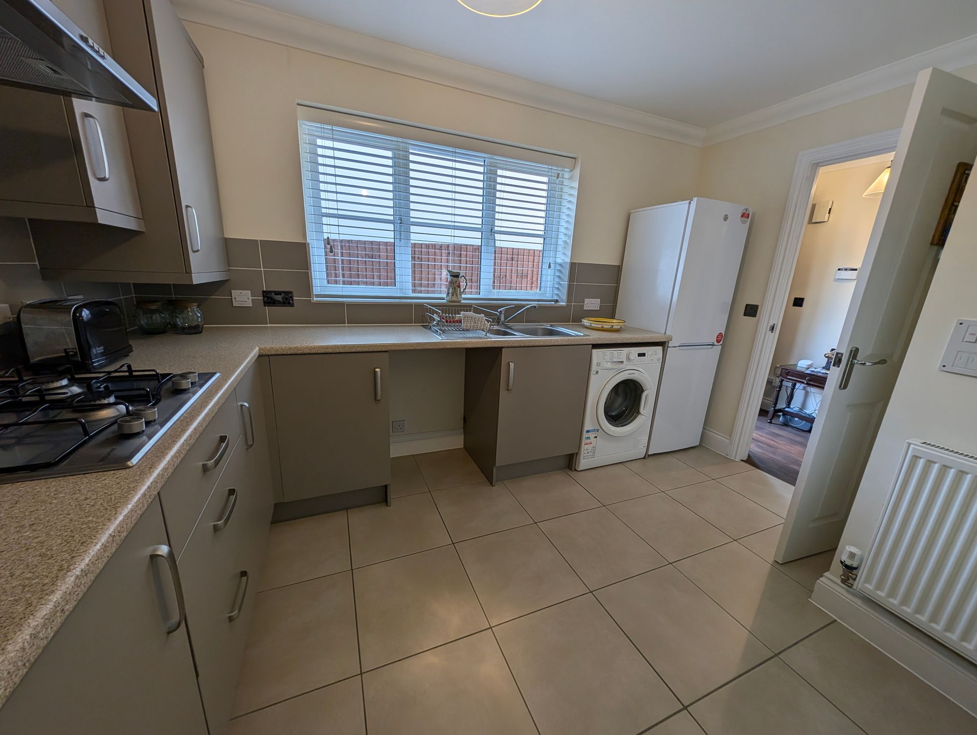 Double glazed window to side aspect. Fitted with a matching range of wall and base units, roll edge work surfaces, incorporating a 1 1/2 sink and drainer with mixer tap. Plumbing for washing machine and space for a dishwasher. Fitted Hotpoint double oven with four ring gas hob and Hotpoint extractor. Space for tall fridge freezer and space for dining table. Tiled floor.