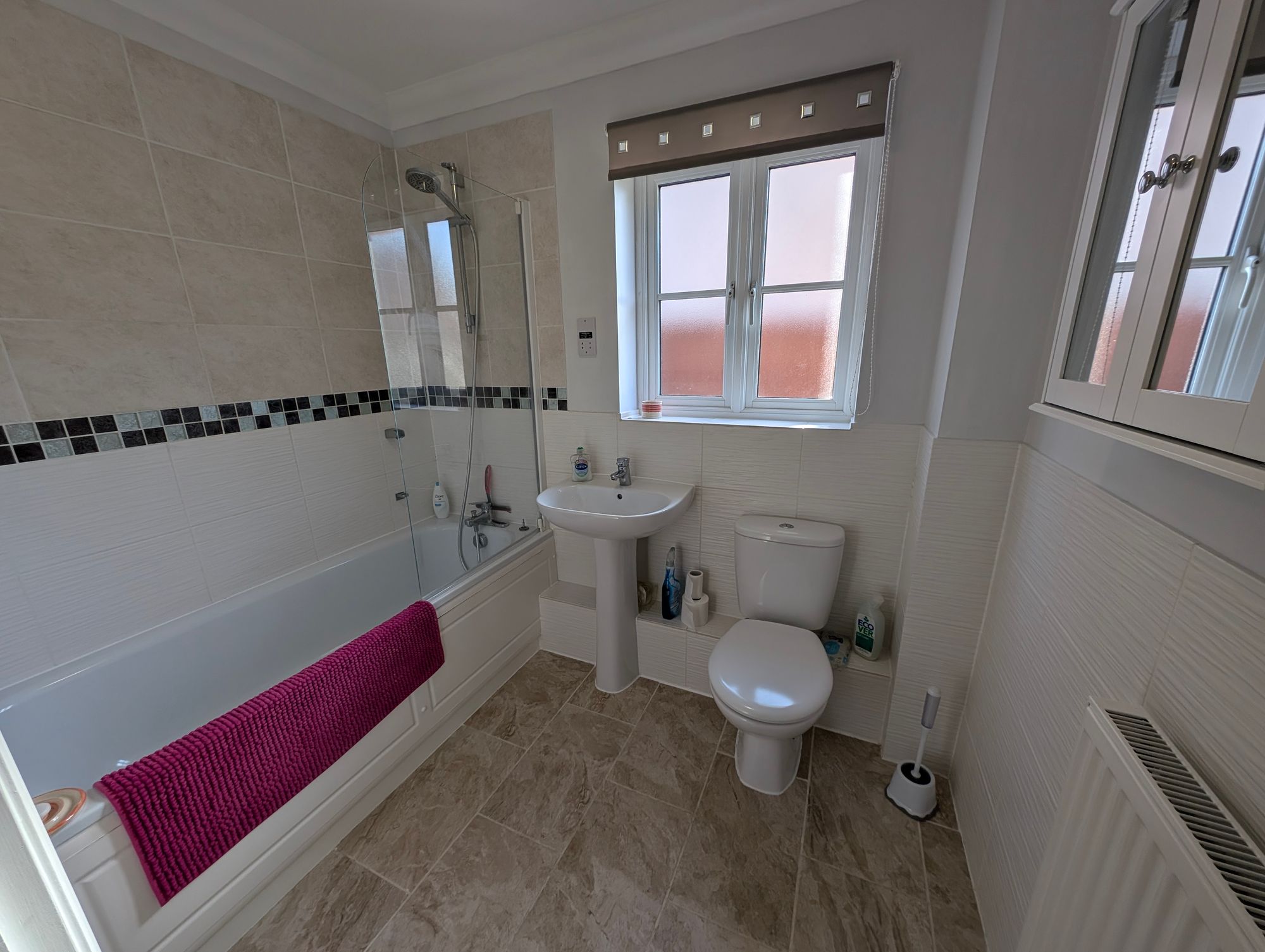 Obscure double glazed window to side aspect. Stylish three piece bathroom suite comprising of panel enclosed bath with mixer tap and shower attachment, pedestal wash basin and low level flush wc. Tiled flooring and part tiling to walls. Extractor fan.