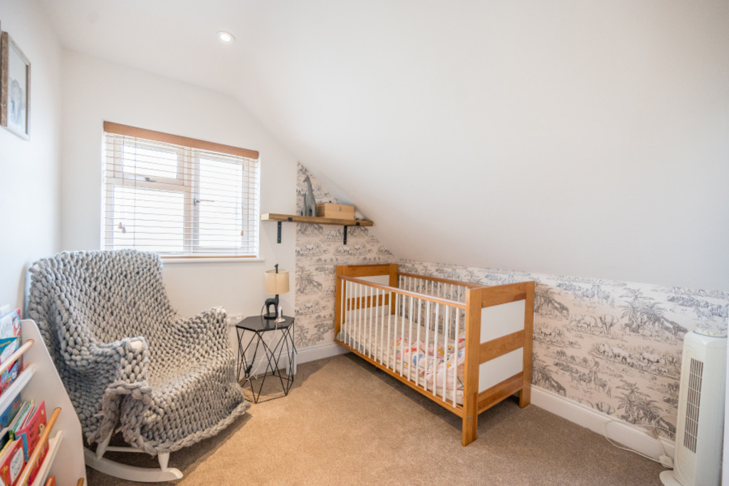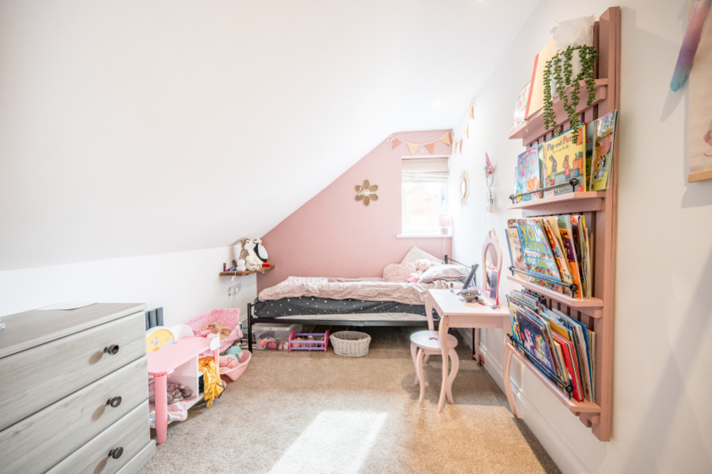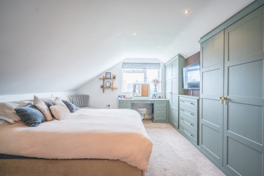 Spacious principal bedroom with fitted wardrobes, drawers and dressing area with dressing table. Additional storage within the eaves.