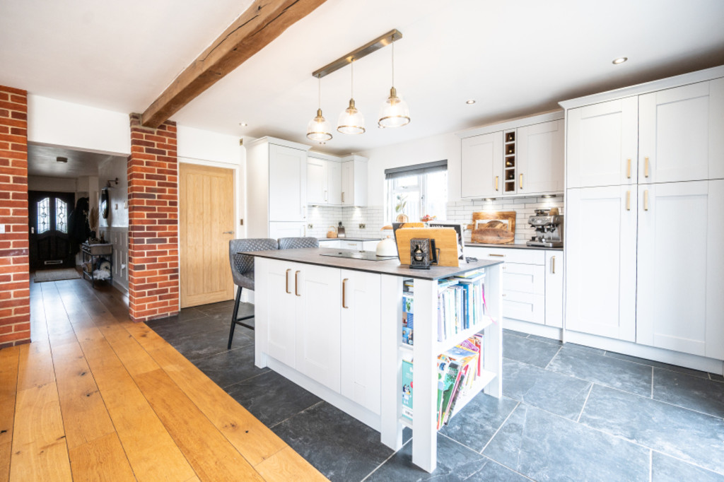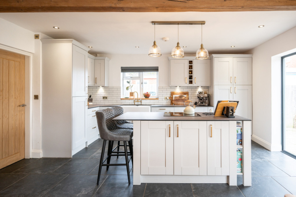 The kitchen is fitted with Shaker-style units with composite worktops, tiled splashbacks and a double-drainer Butler sink with mixer tap. Integrated appliances include double ovens and additional built-in appliances, complemented by recessed lighting.