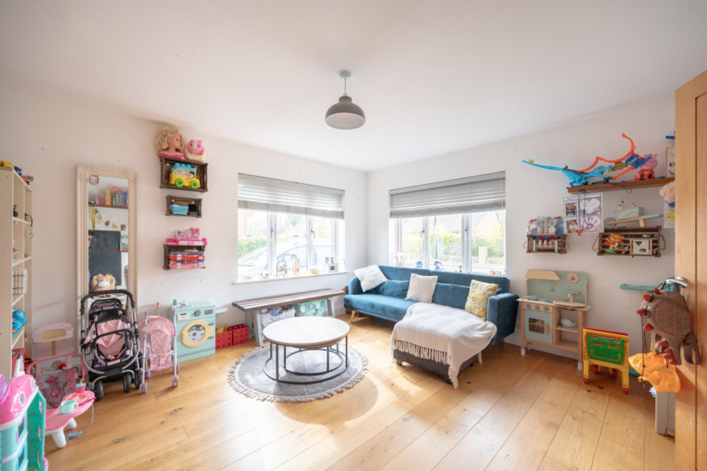 A generous room with windows to the front and side aspects and engineered wood flooring, ideal as an additional sitting room, playroom or studio.