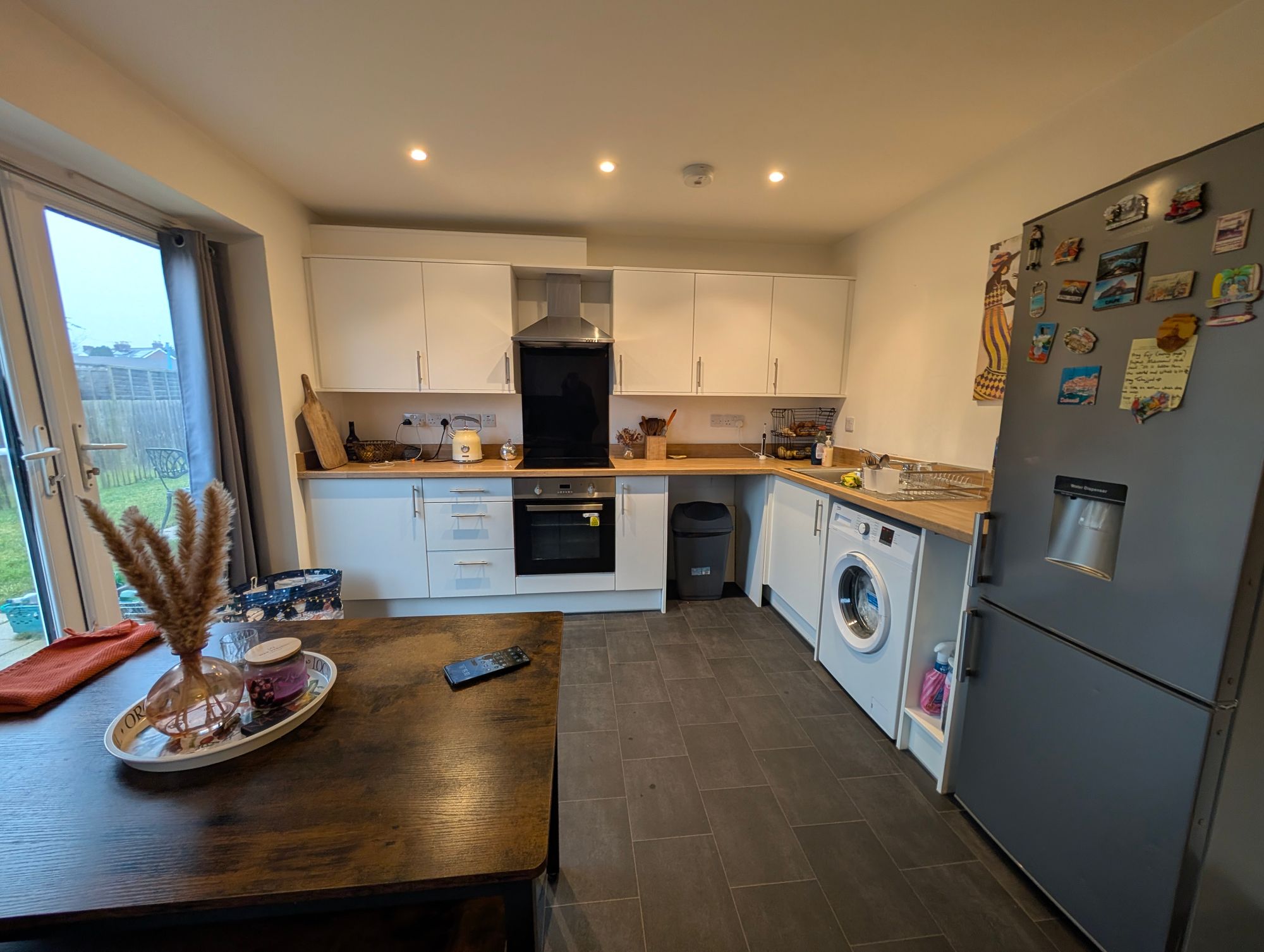 The kitchen area is fitted with a range of high and low-level units with roll-edge work surfaces and matching upstands. Appliances include an electric oven, electric hob with extractor hood, and space for a fridge/freezer and washing machine. A single drainer sink with mixer tap completes the kitchen.