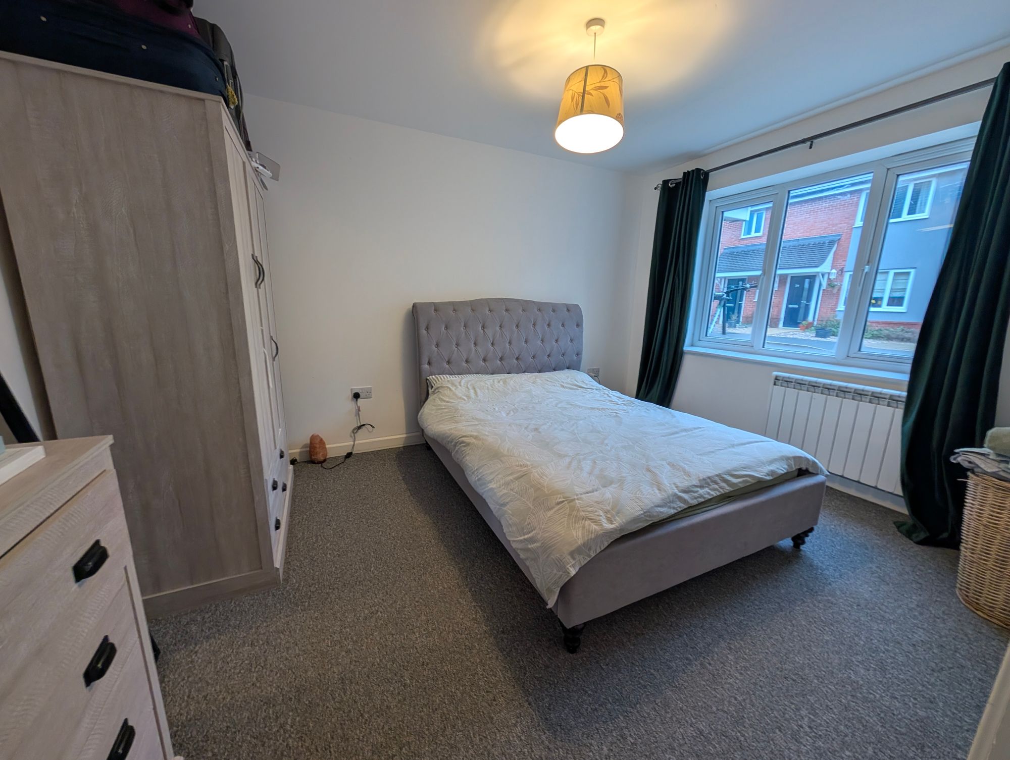 A generous double bedroom positioned to the front of the property, featuring a large window providing excellent natural light and an electric radiator. The room offers ample space for wardrobes and additional bedroom furniture.