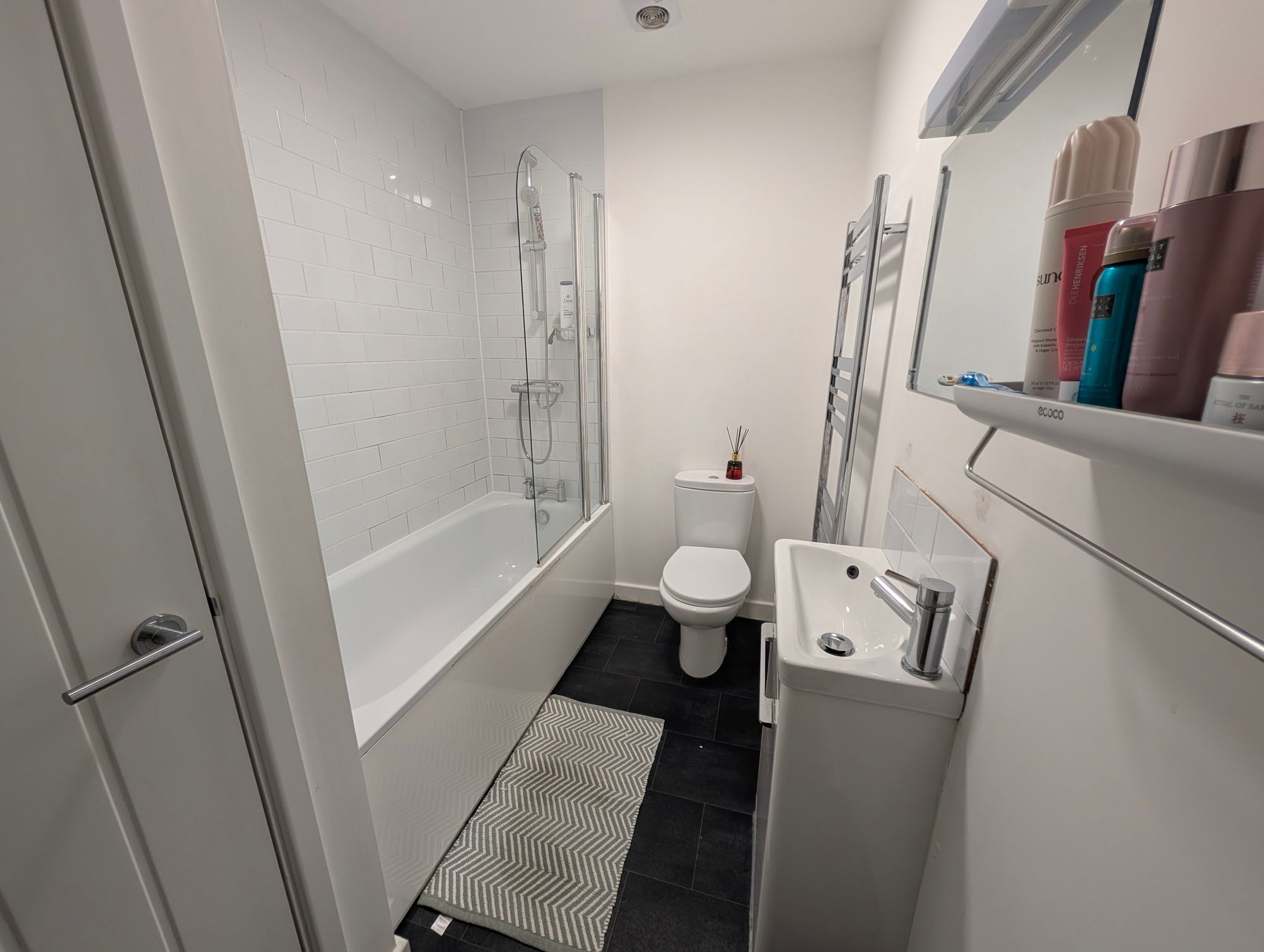 Fitted with a white suite comprising a panelled bath with overhead mixer shower, WC, and pedestal wash hand basin with storage below. Additional features include a heated towel rail and housing for the pressurised hot water cylinder and solar meter.