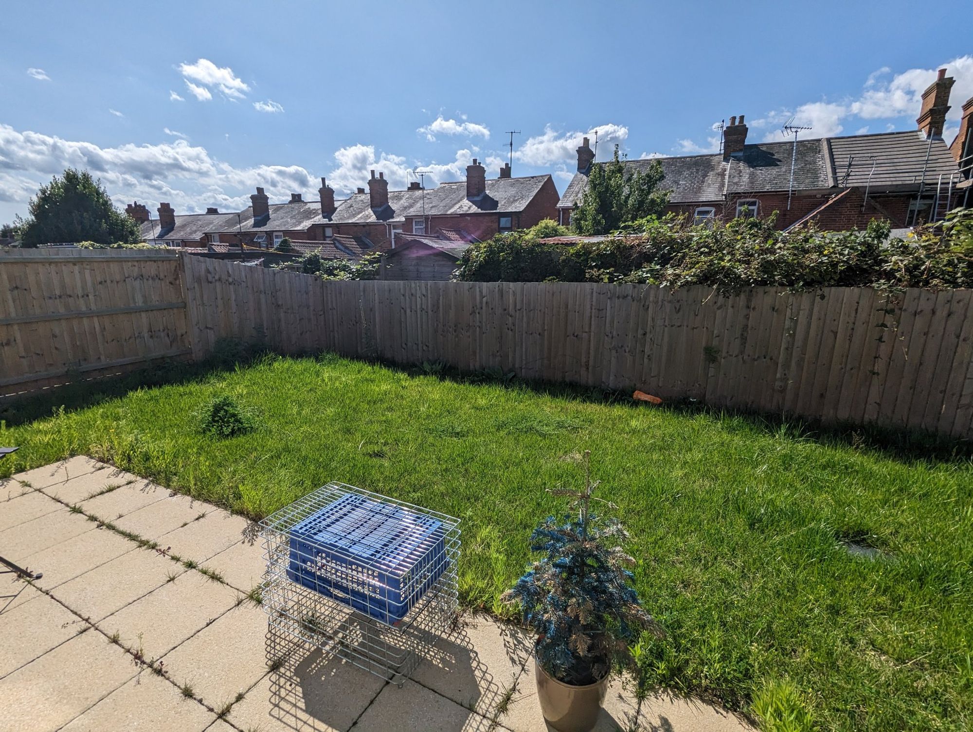 The rear garden is designed for ease of maintenance and features a patio seating area, ideal for outdoor dining, along with a garden shed providing useful storage.