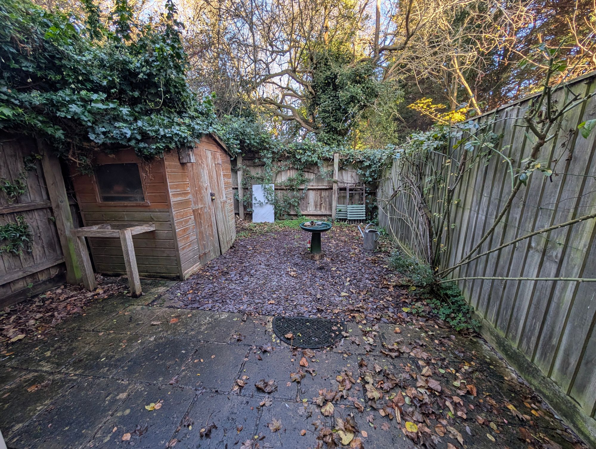 The rear garden is fully enclosed and features a small lawned area, patio seating space, and timber storage shed-perfect for relaxing or low-maintenance outdoor living.