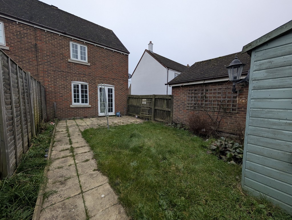 Fully enclosed and mainly laid to lawn with a patio seating area and pathway leading to a large storage shed with power connected - ideal for hobbies, storage, or a small workshop.