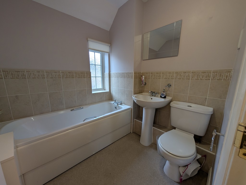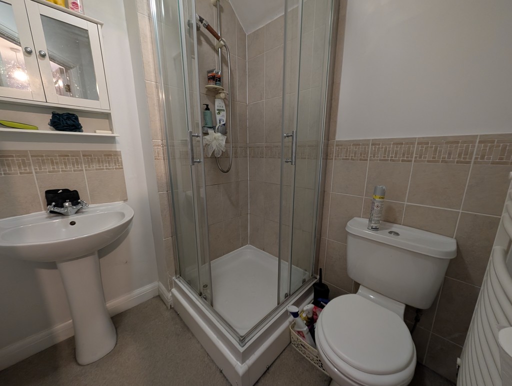 Comprising a corner shower cubicle, WC, pedestal wash hand basin, heated towel rail, partially tiled walls, and window.