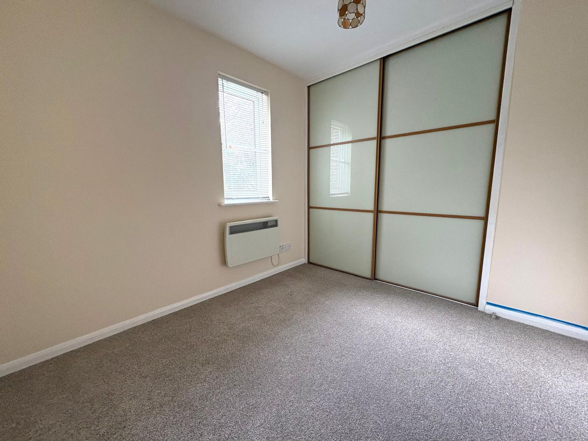 The bedroom is a comfortable double with a window to the side aspect, built-in wardrobe, fitted carpet, and storage heater. The bathroom is fitted with a panel bath with electric shower over, low-level WC, and pedestal wash hand basin, complemented by fully tiled walls and flooring, a wall-mounted cupboard, and extractor fan.
