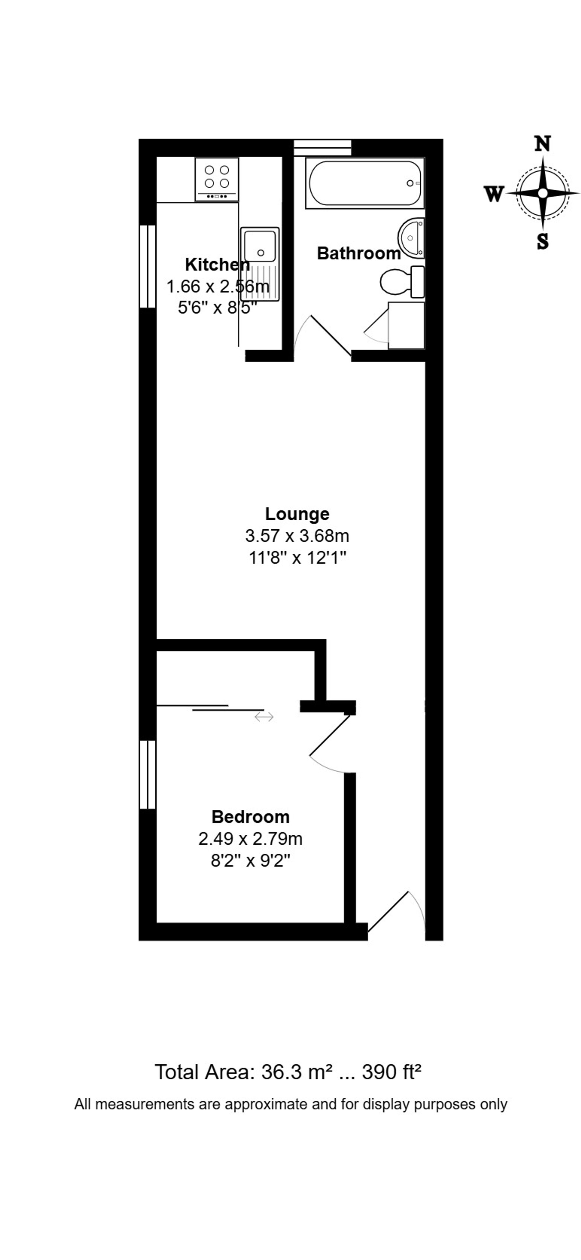The apartment is accessed via a covered entrance leading into a communal hallway, with a private door opening into the property. Inside, the accommodation comprises an entrance hall leading through to a bright and spacious sitting room, featuring a bay window and additional side window allowing for plenty of natural light. The sitting room is open plan to a modern fitted kitchen, which includes a range of base and wall units, an inset electric oven and hob with extractor over, stainless steel sink unit, and space for a fridge and washing machine.