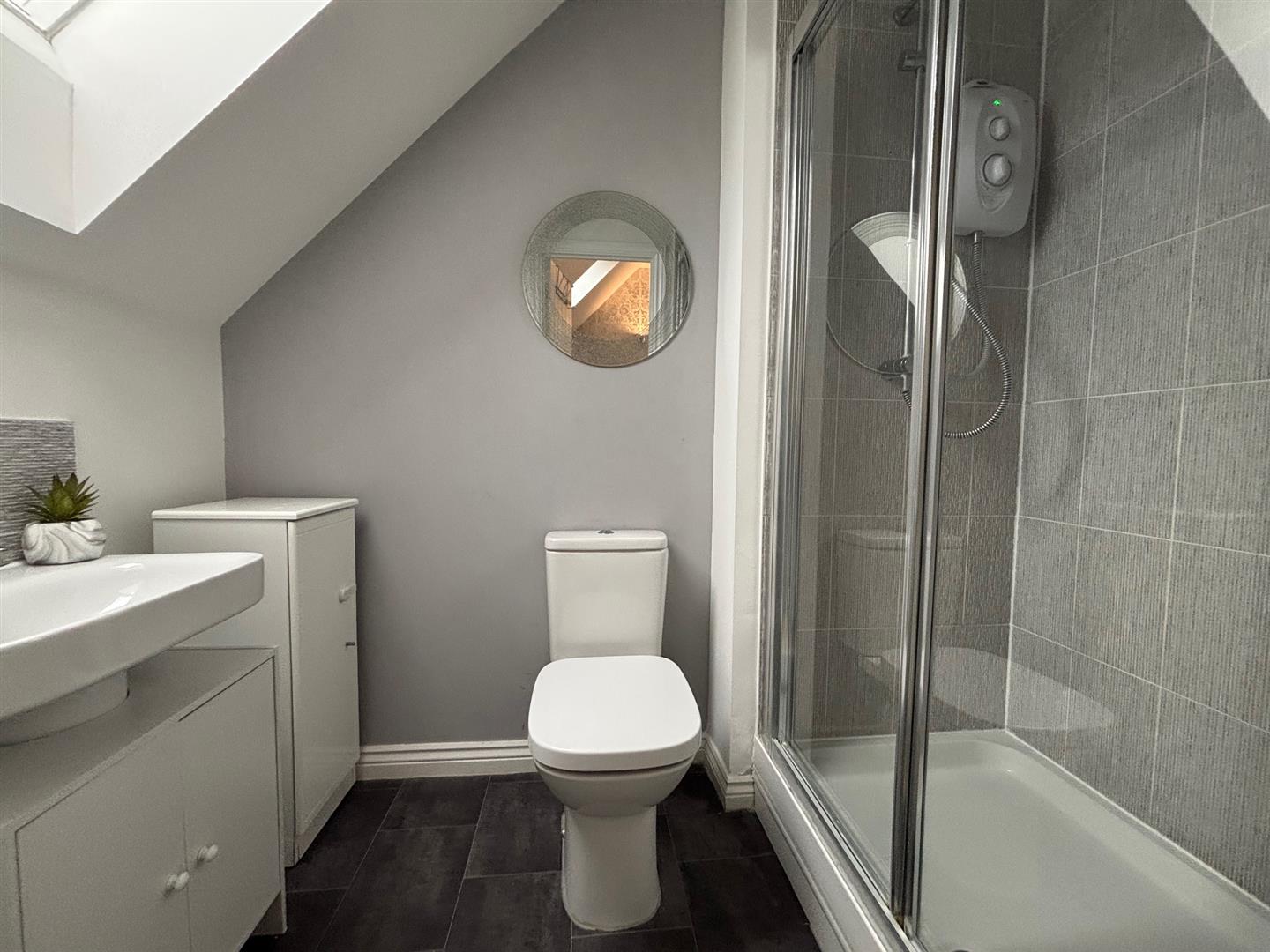 Shower cubicle, low level wc hand wash basin.