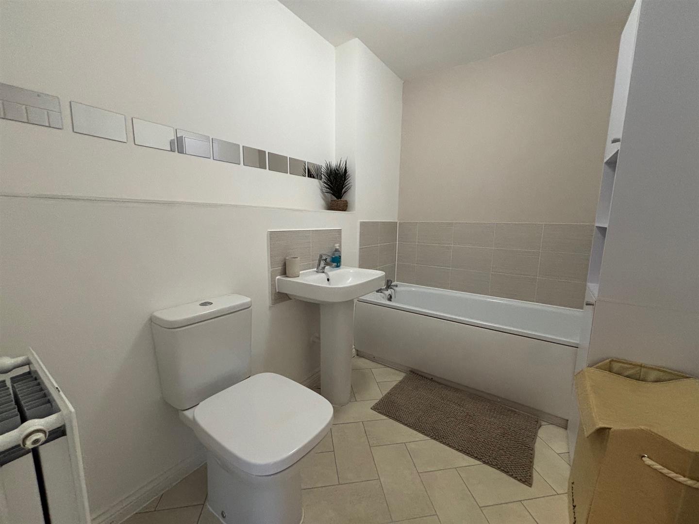 panelled bath, low level WC, hand wash basin, radiator.