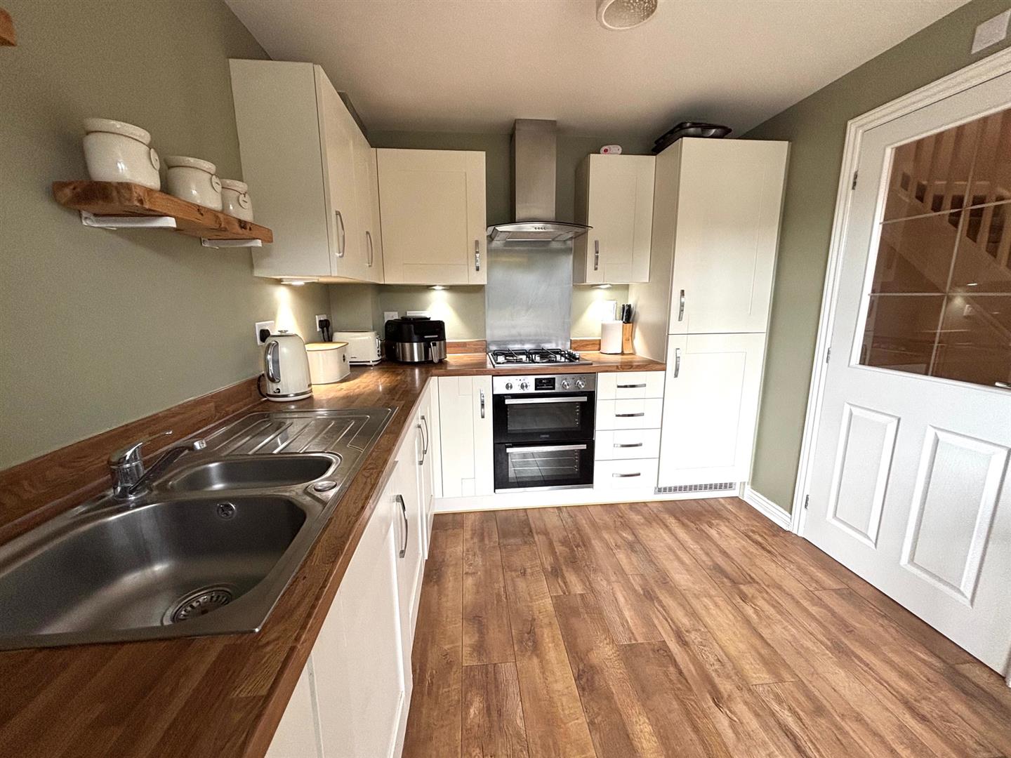 Double glazed window to front, wall and base units with under lights under, 1 1/2 stainless steel sink and drainer, integrated appliances, integrated oven, 4 gas hob and extract.