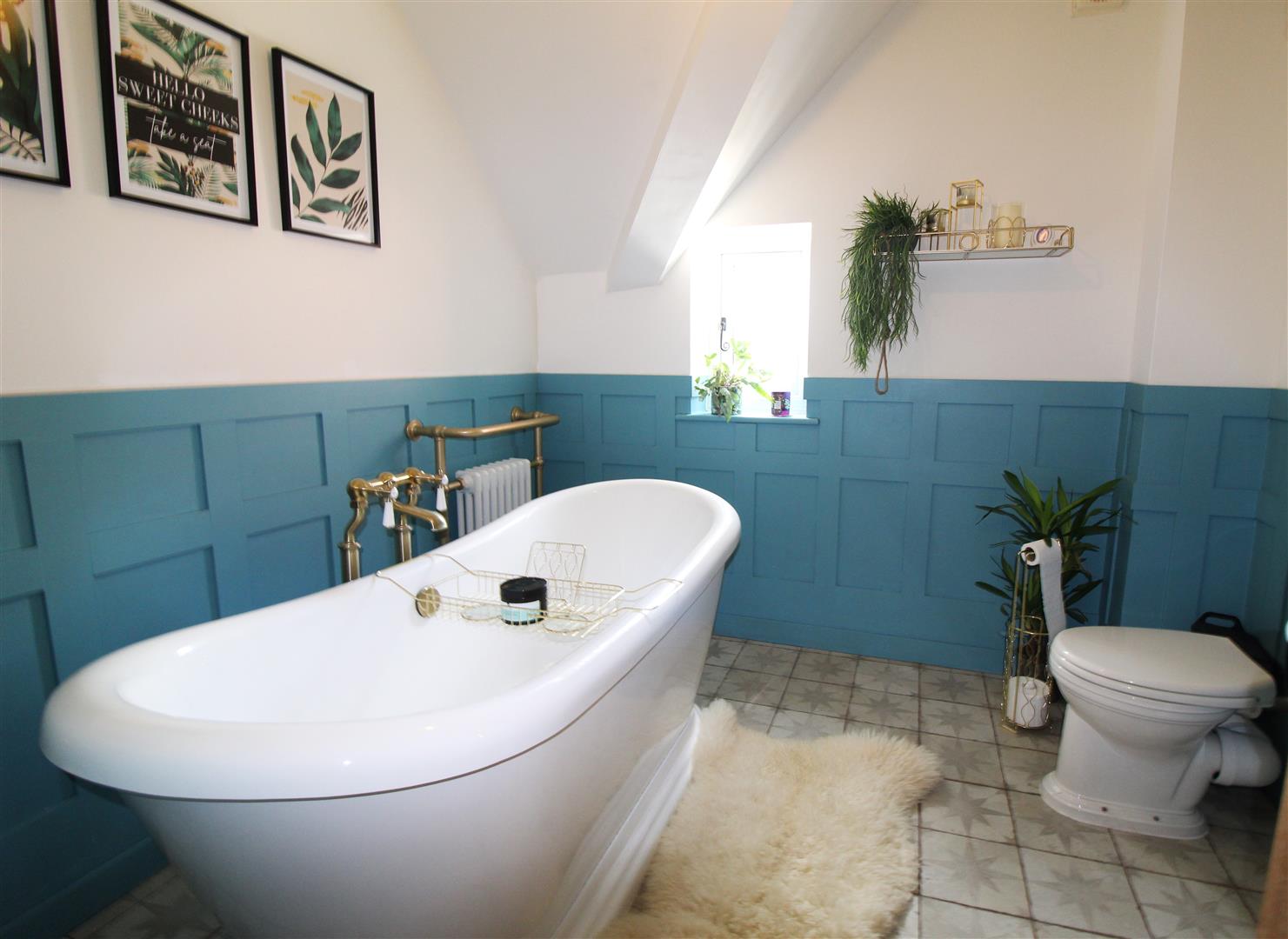 With double glazed window to side aspect, with suite comprising free standing roll top bath with shower mixer tap attachment, low level W.C, wash hand basin, radiator.