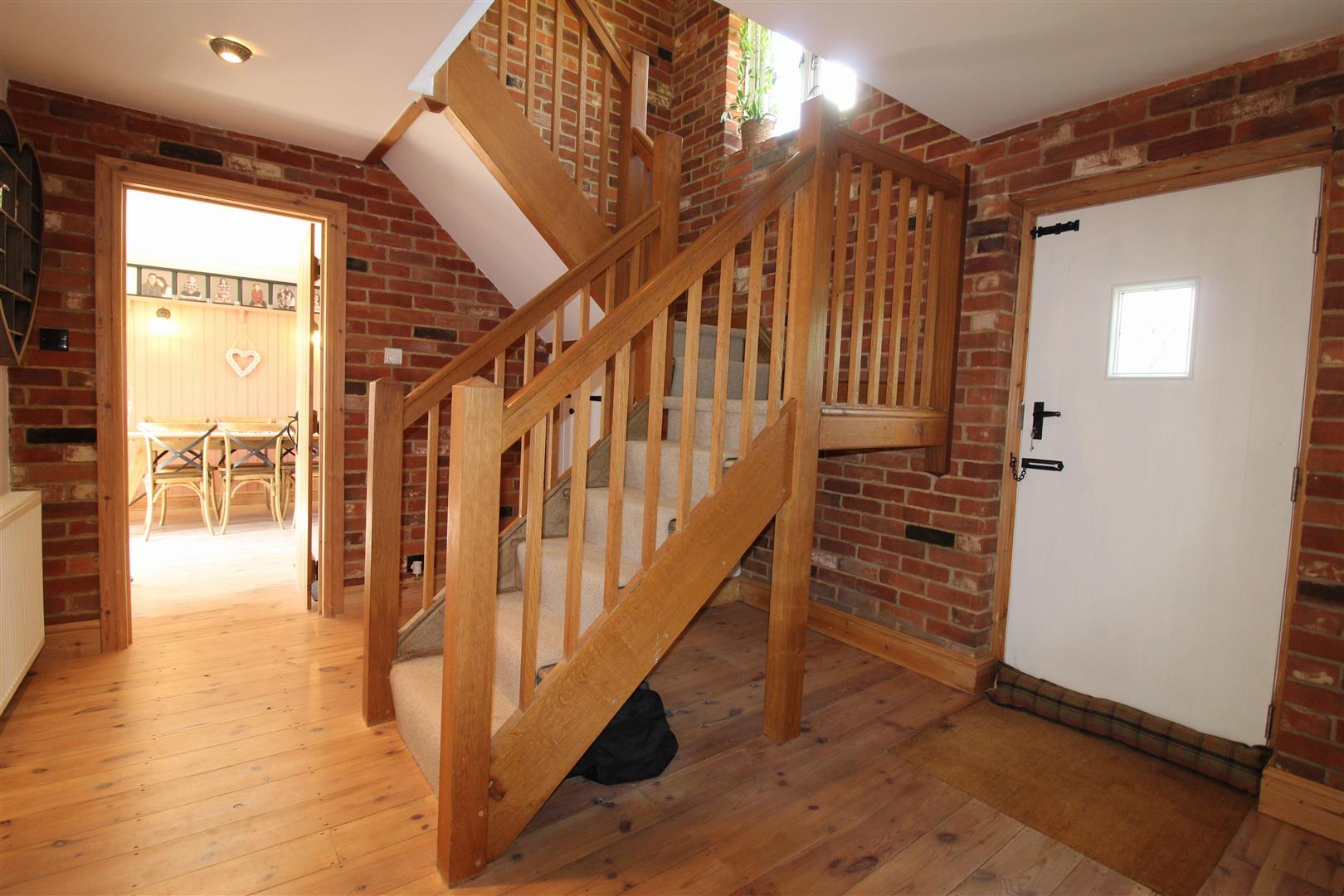 A spacious hallway with exposed floor boards, wooden open stairs to first floor, exposed feature brick wall, wooden doors leading to...