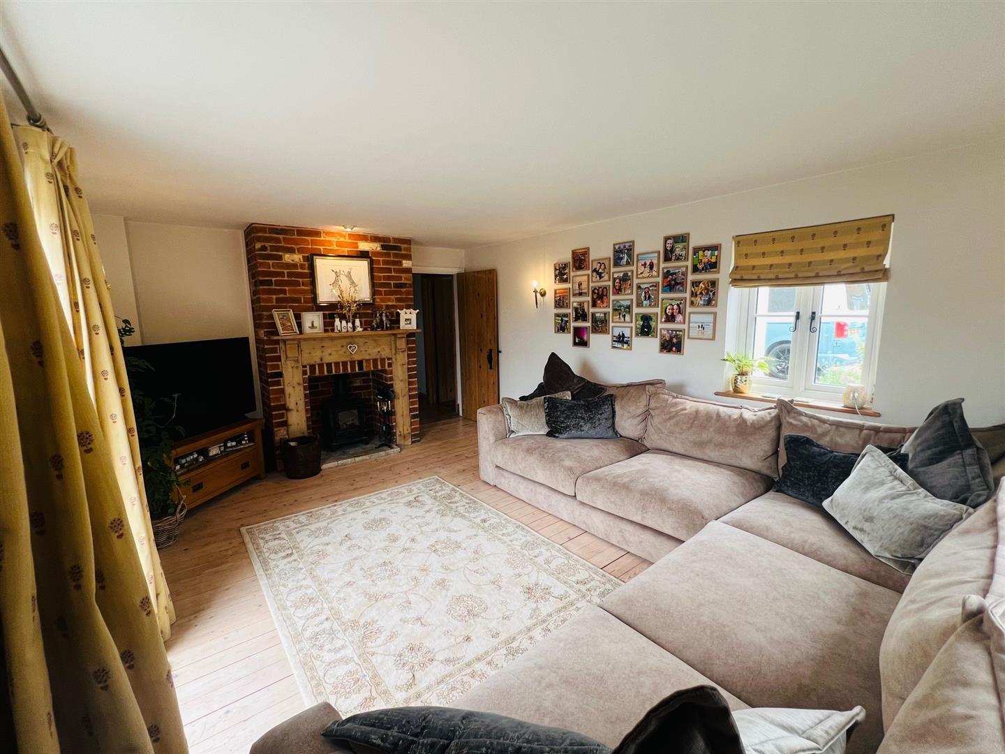 With double glazed French doors to side, double glazed windows to rear and side, feature fireplace with brick surround with inset wood burner.