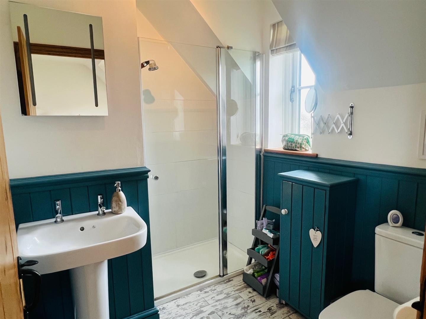 With double glazed window to front aspect, fitted suite comprising double shower cubicle, low level W.C, wash hand basin, heated towel rail.