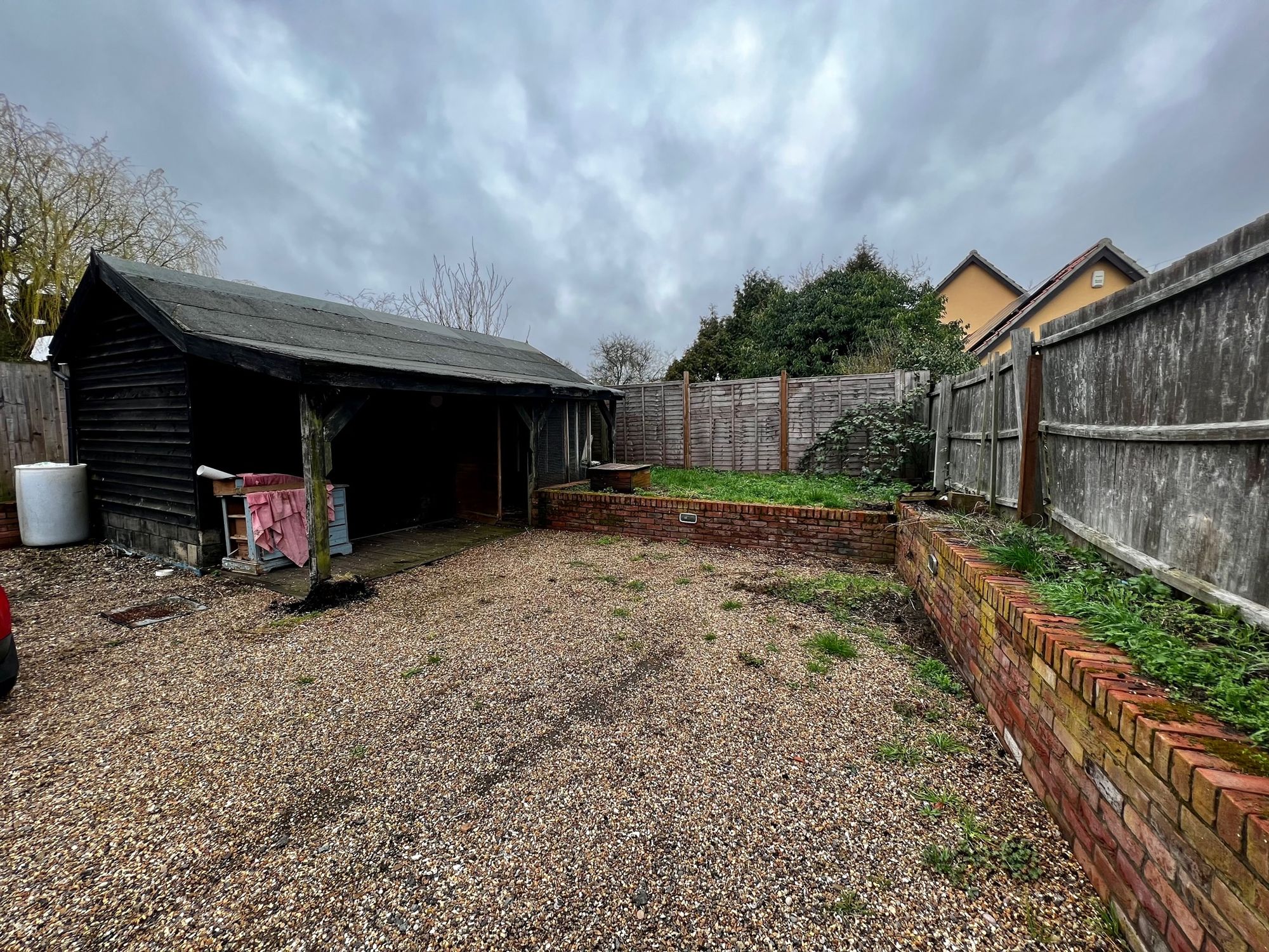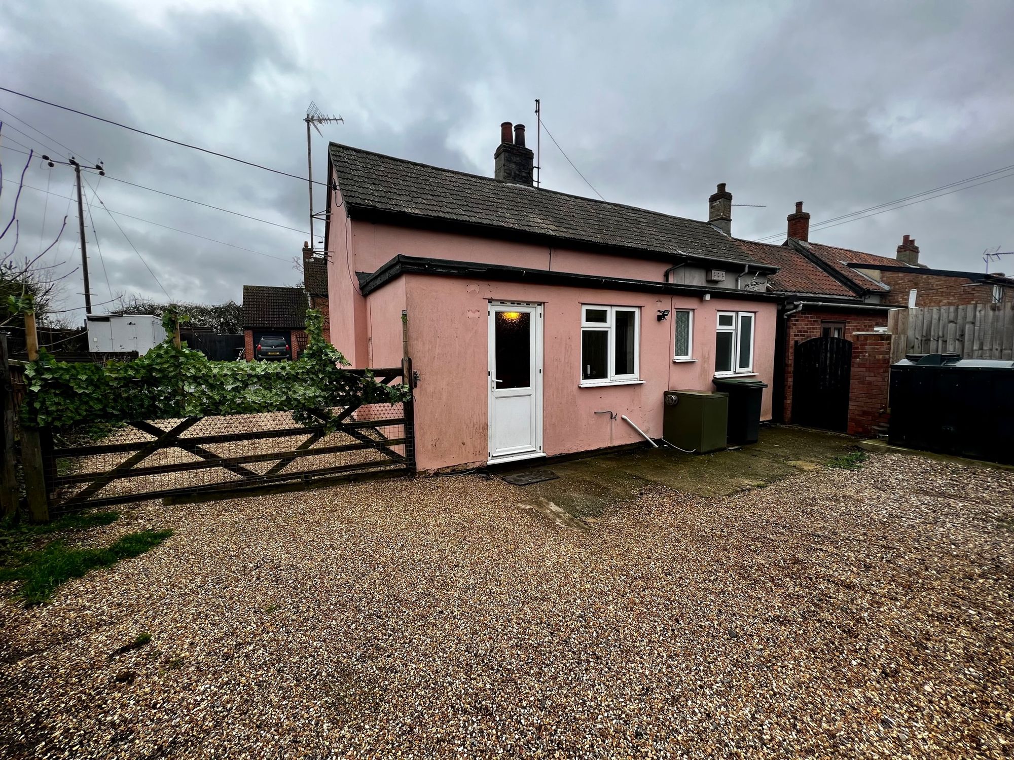 The property benefits from a gravel driveway leading to a five-bar gate, providing off-road parking. The garden is mainly laid to gravel for ease of maintenance, complemented by a lawned area. There is also a useful outhouse with power, offering excellent storage or workshop potential.