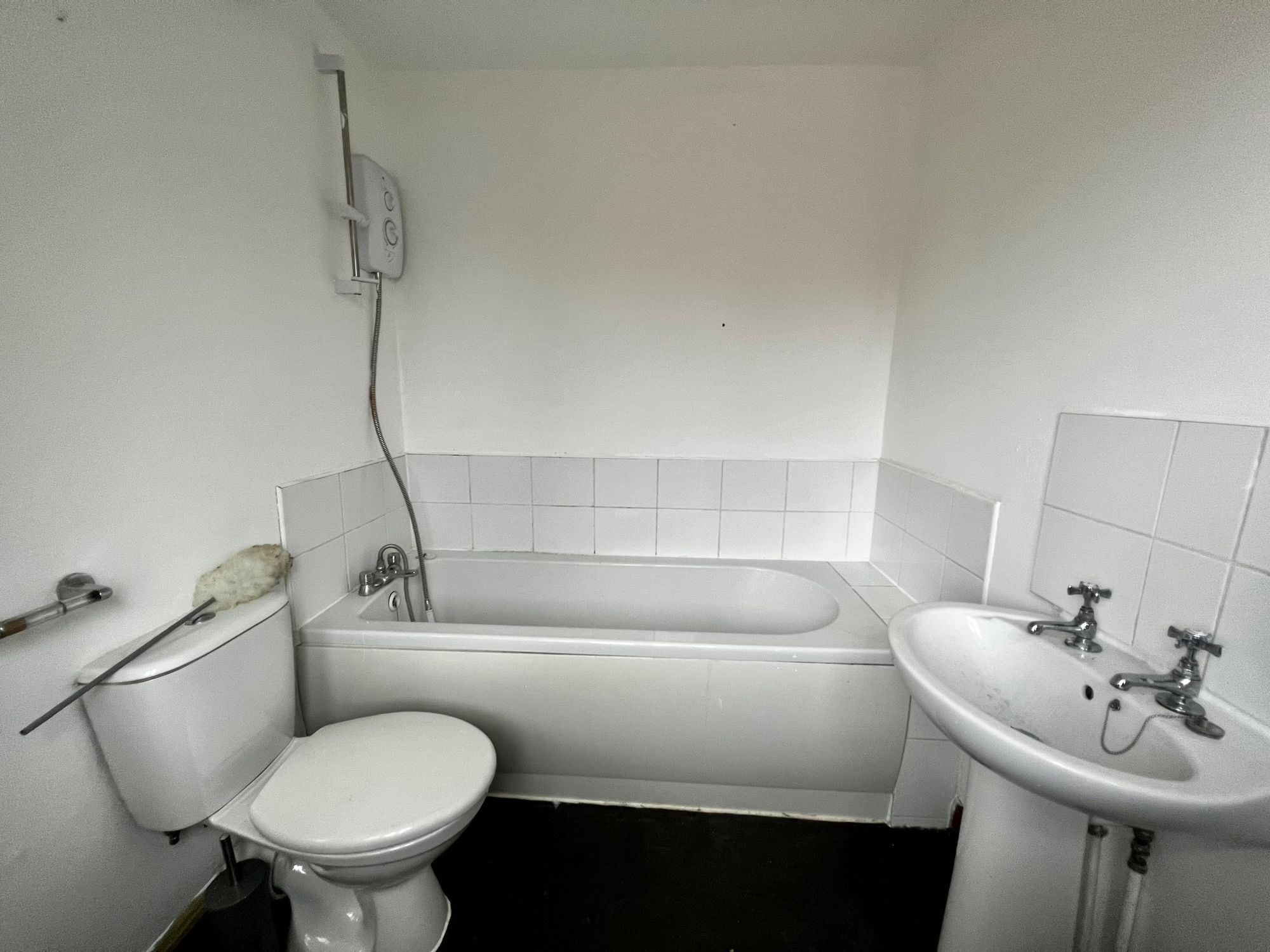 Comprising a modern white suite including a panelled bath with electric shower over, low level WC, and pedestal wash hand basin. Finished with a rear aspect window and radiator.