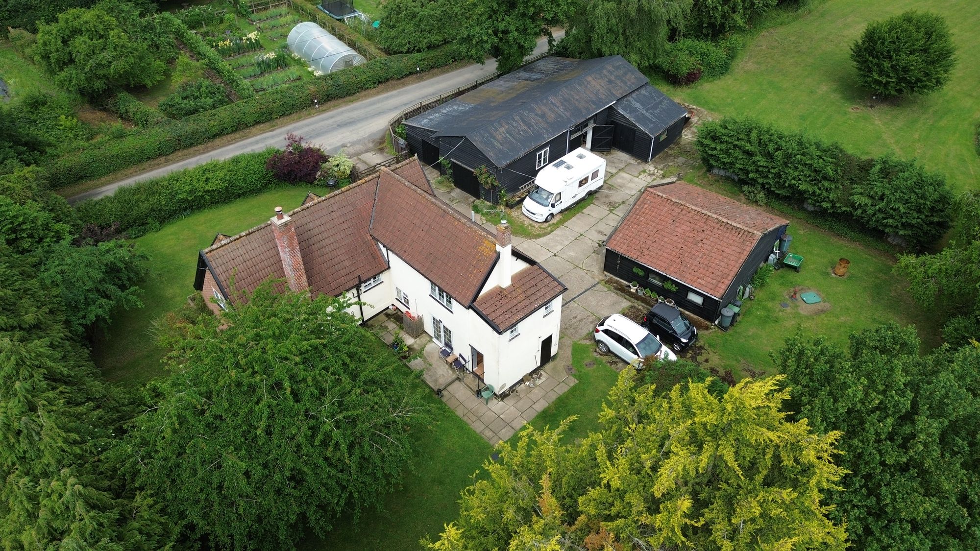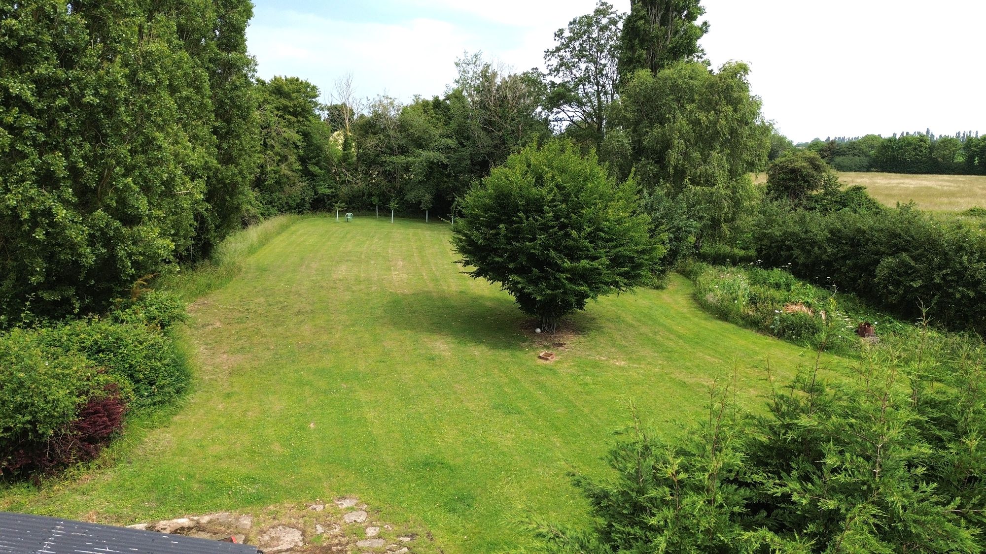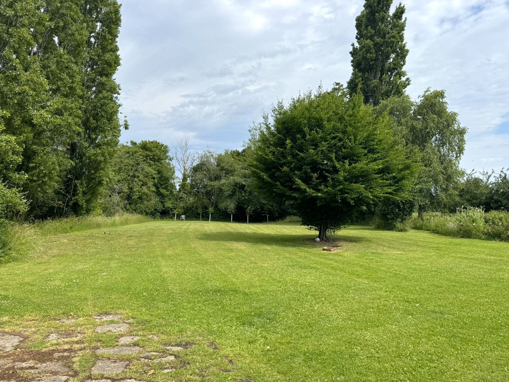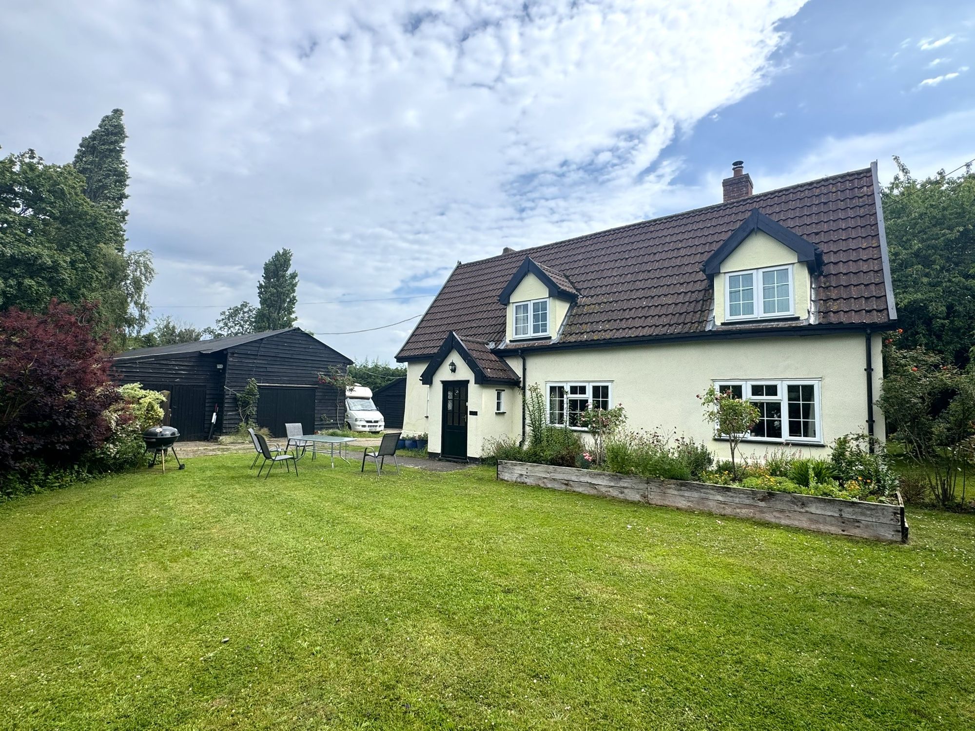 Beautiful mature cottage garden with trees, lawned and hedged surrounds.