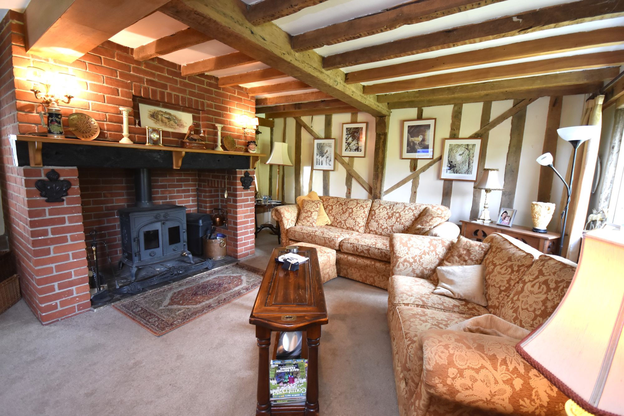 Two double glazed windows to front and two windows to rear, wood burner with brick surround and bressumer beam over. Feature wall and ceiling beams.