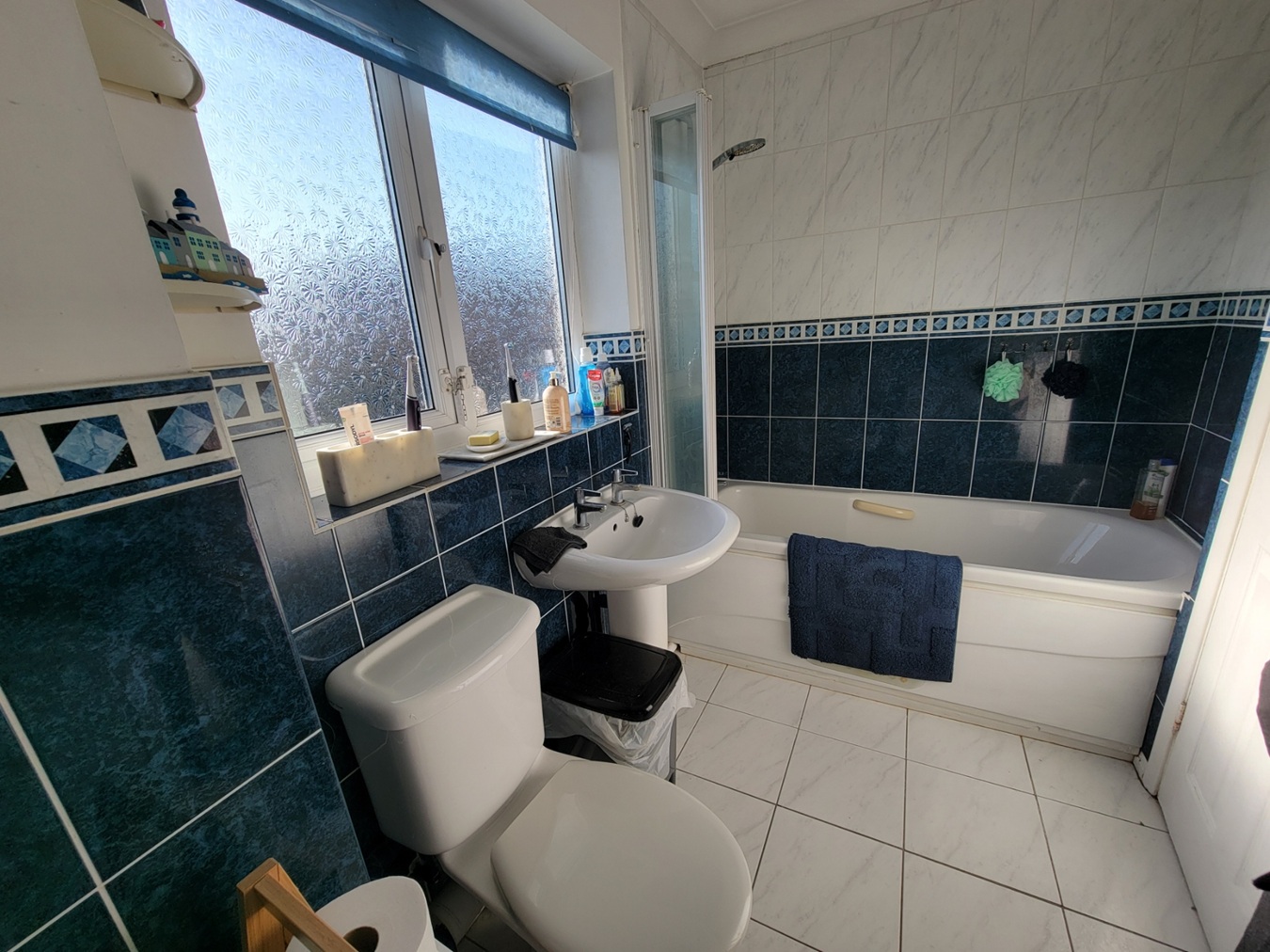 White suite comprises low level wc, pedestal wash hand basin and panel bath with shower connected over with glazed screen, heated towel rail, extensively tiled walls, tiled floor, PVC double glazed window to the rear aspect.