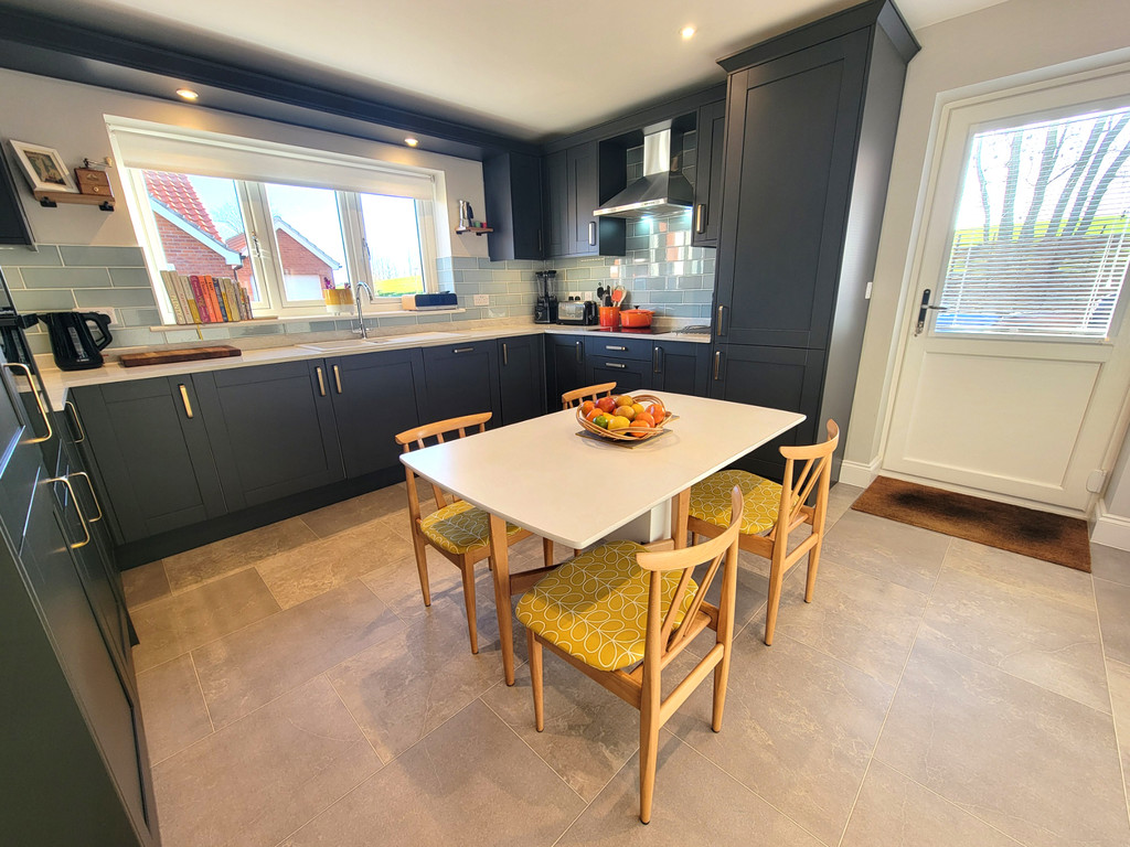 KITCHEN/DINING ROOM: 12' 9" x 12' 9" (3.89m x 3.89m) Attractive and stylish fitted kitchen having panelled doors and drawer fronts, quartz worktops inset with one and a half bowl sink unit with mono mixer tap, integrated fridge/freezer and dishwasher, eye level stainless steel and glass double oven and grill, integrated washer/dryer, inset black glass ceramic hob, stainless steel extractor connected over, contrasting glazed metro style wall tiling, inset spotlights, inset pelmet lighting, Karndean style tile effect flooring, wall mounted gas fired boiler concealed within a cupboard, generous PVC double glazed window with views to the front, half glazed PVC door opens directly to the drive and garage.
