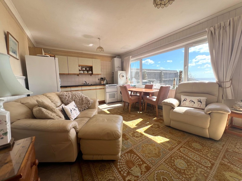 Large uPVC window and door to rear garden and superb sea views. Kitchen area is fitted with a range of base units with cupboard and drawers below, further wall units above, stainless steel sink unit with mixer tap, space for fridge /freezer, washing machine and gas oven, wall mounted Valiant gas boiler. Tiles splash backs and tiled floor, radiator. sitting room area, tiled floor, part wood panelling to walls, UPVc door to rear garden.