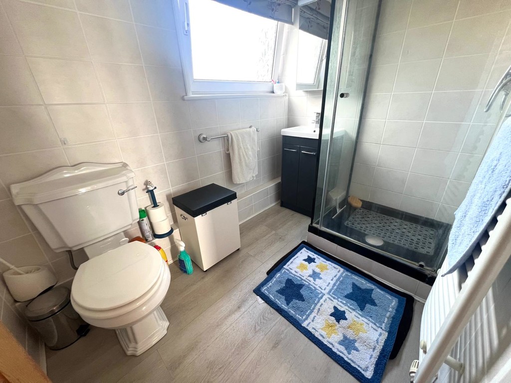 SHOWER ROOM: UPVC frosted window to front aspect, white suite comprising low level W.C, hand basin inset into vanity unit, shower cubical, tiled walls, towel radiator and laminate flooring.