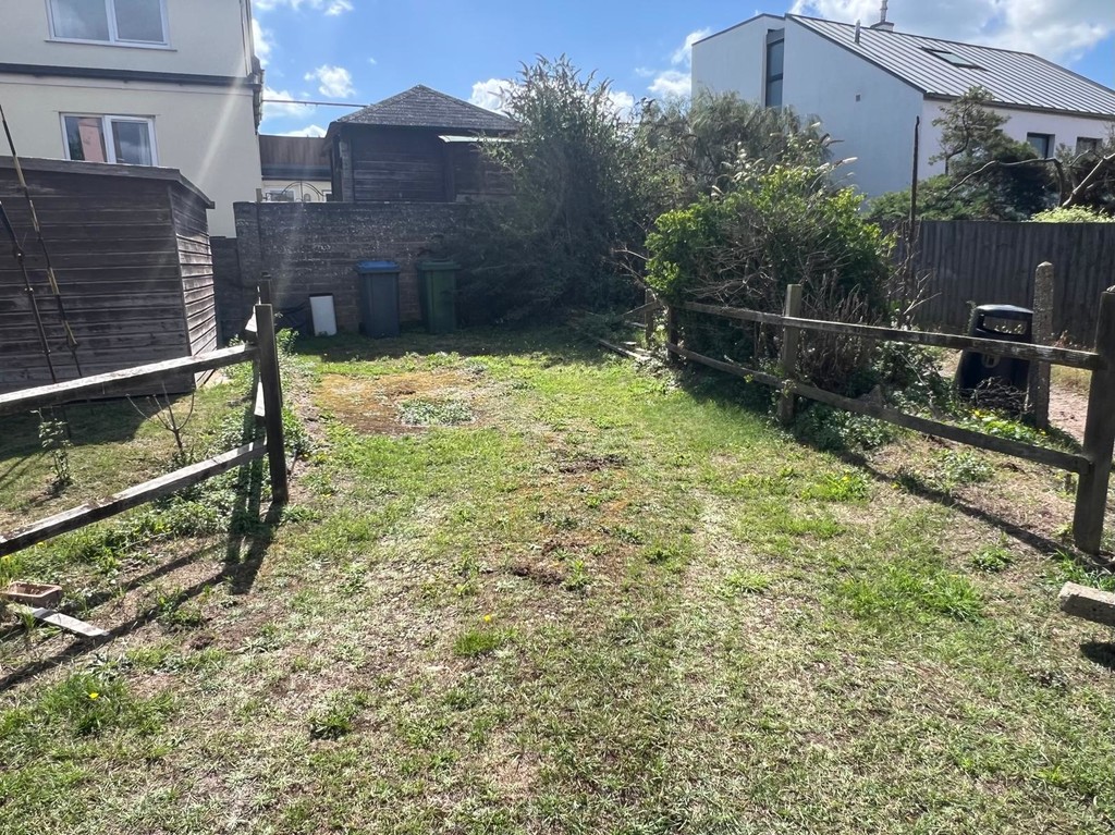 OUTSIDE: The front is approached via a concrete staircase to a walled terrace Rear garden is mainly laid to lawn, with timber fencing either side and a small fence and gate to the beach.