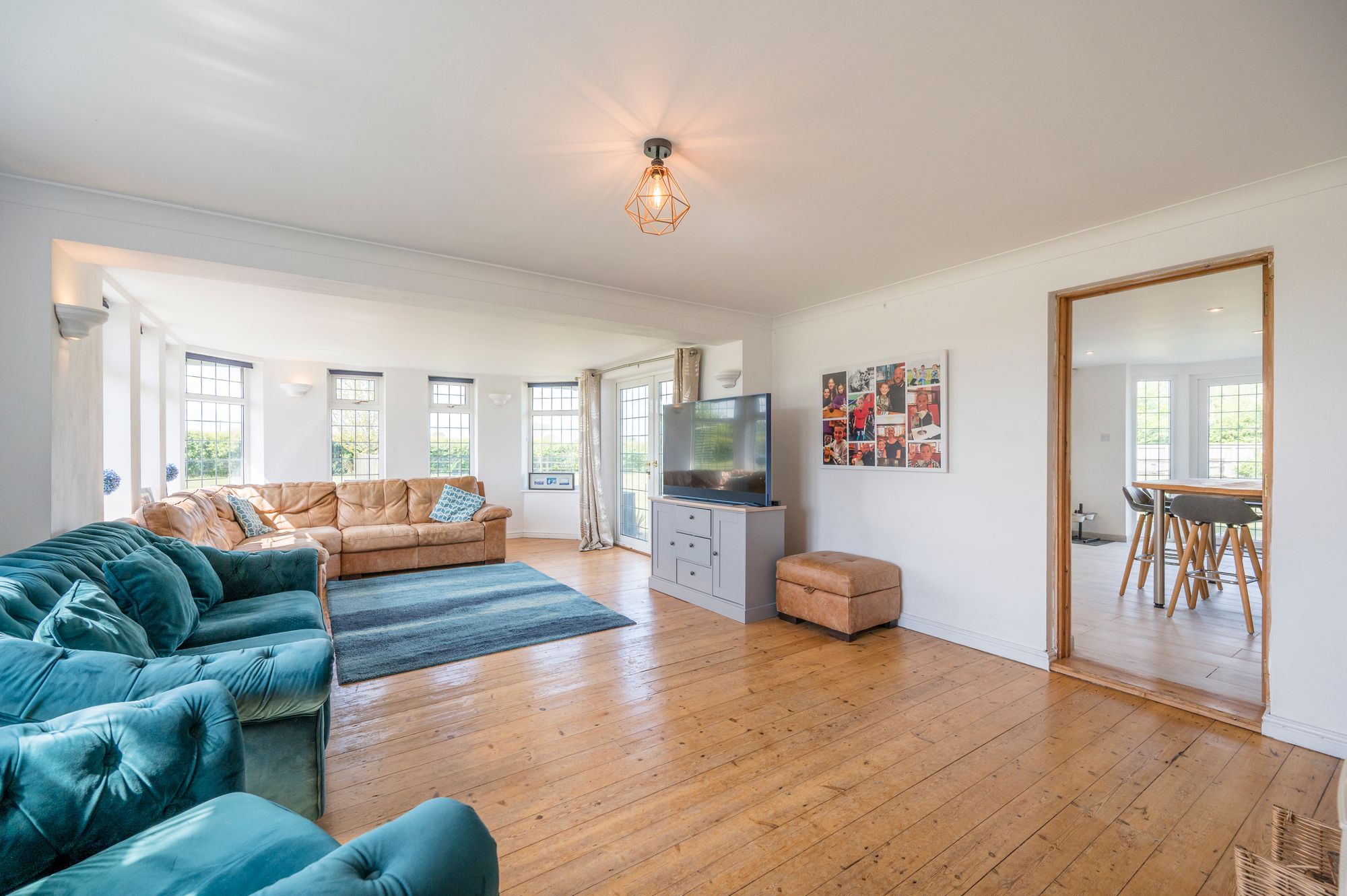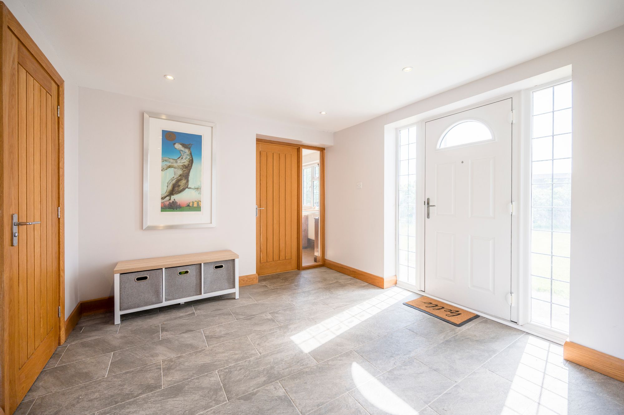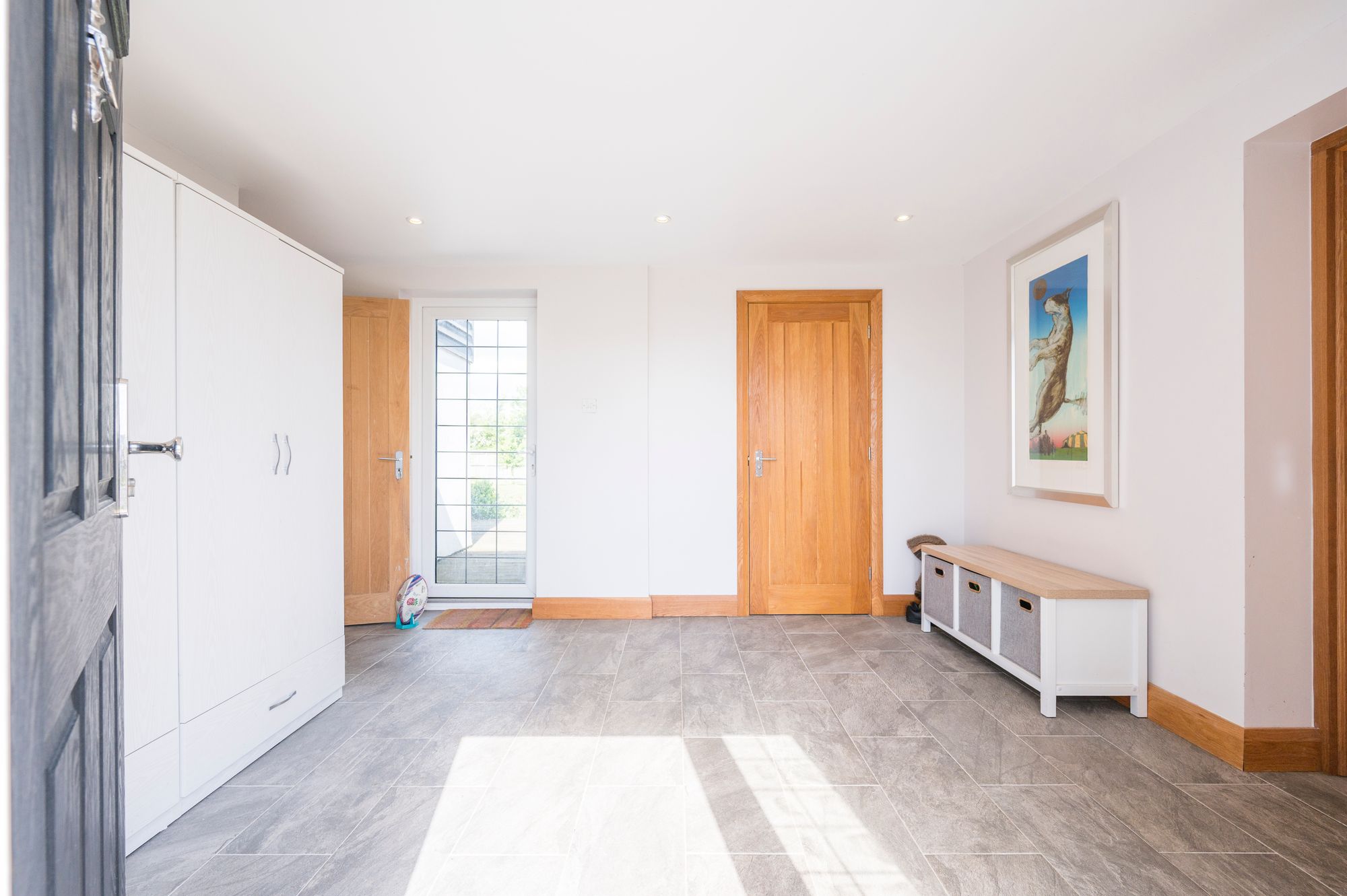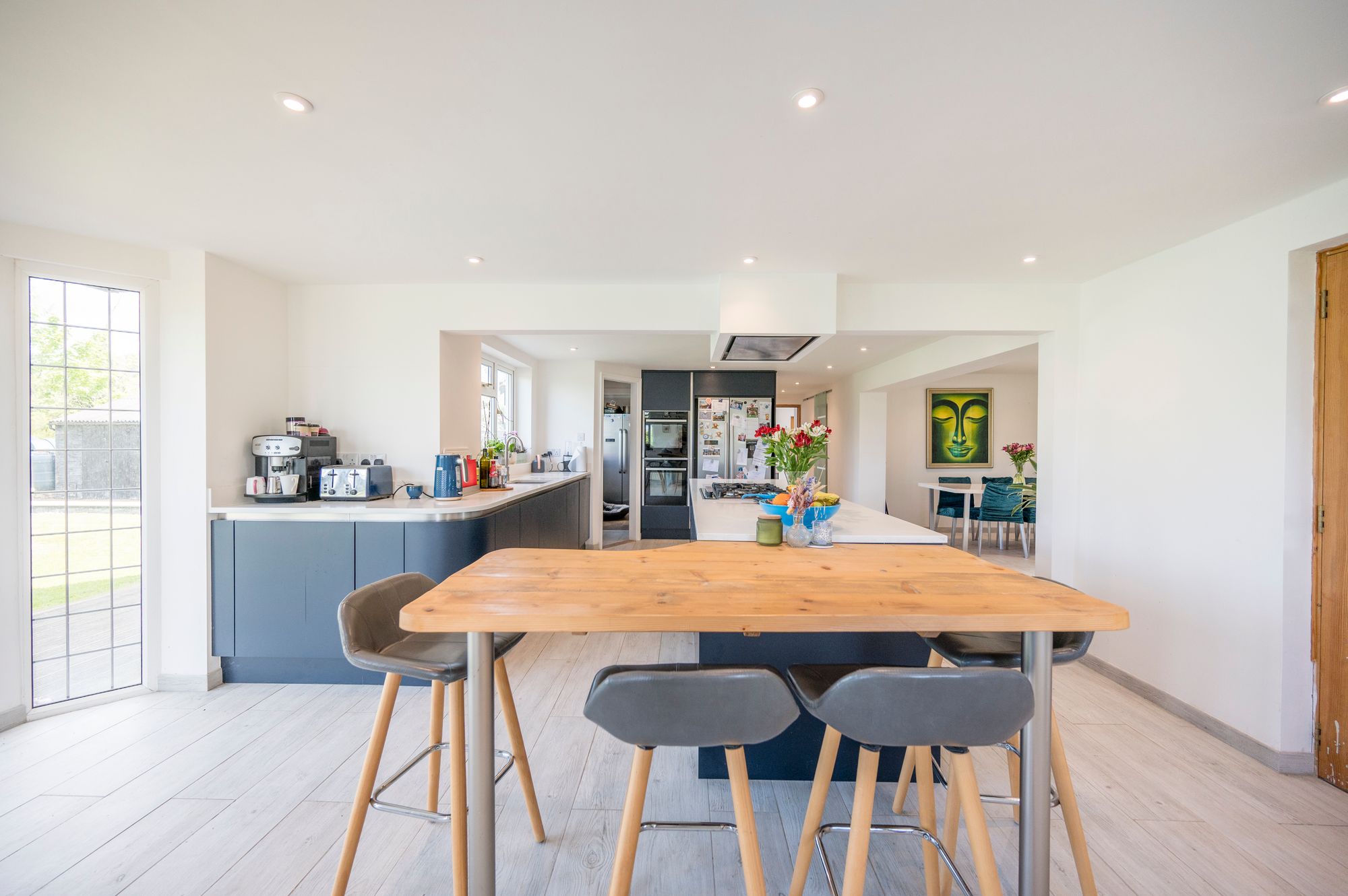 The main door to the front of the house provides access to a reception hall. Off this is a cloakroom with WC, a door to the rear of the property, to the kitchen, and also to an extensive reception room which is currently used as a playroom/gym. Off this is a ground floor large double bedroom that has French door opening to the rear garden and a door into a bathroom with bath, shower, WC and hand wash basin. The house has a most impressive open plan and spacious kitchen/dining room which enjoys views from windows and French doors over the gardens. It is fitted with a modern range of high and low level wall units that include an integrated dishwasher, two electric ovens and space for a fridge/freezer. There is a kitchen island with five ring gas hob. The room has recessed spotlighting and tiled flooring in a timber style. Off this is a particularly useful and large larder and pantry. Doors lead to a front hallway, the sitting room and also to the utility room. This has high and low level wall units, space and plumbing for a washing machine and off this, is a second ground floor cloakroom with WC. The front hallway has stairs to the first floor landing, a door to a snug or study and a further door to the particularly spacious sitting room. This is triple aspect with windows and French doors overlooking the gardens. There is a fireplace with woodburning stove and exposed floorboards.