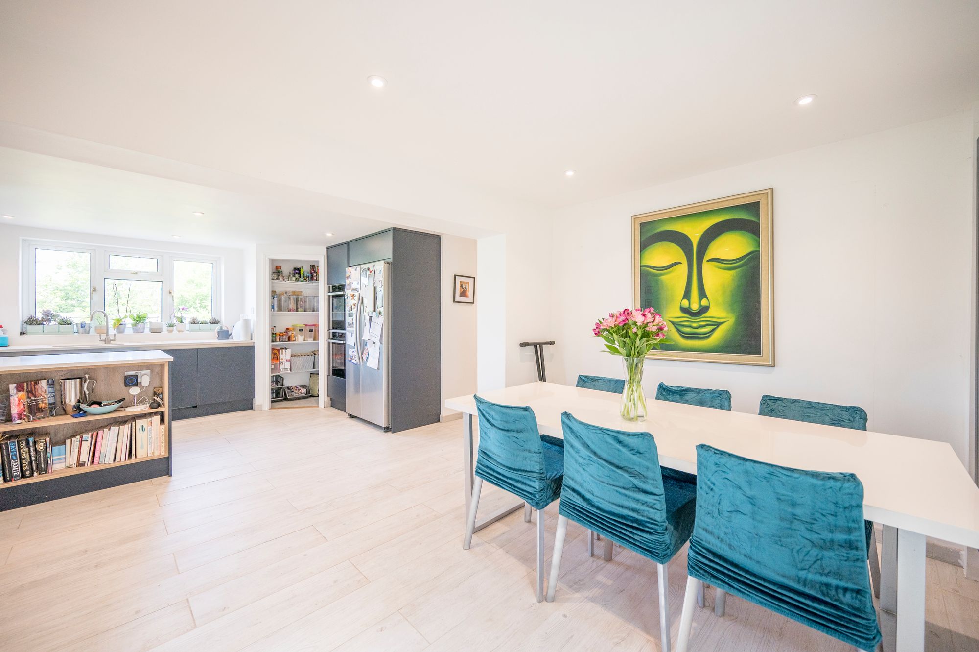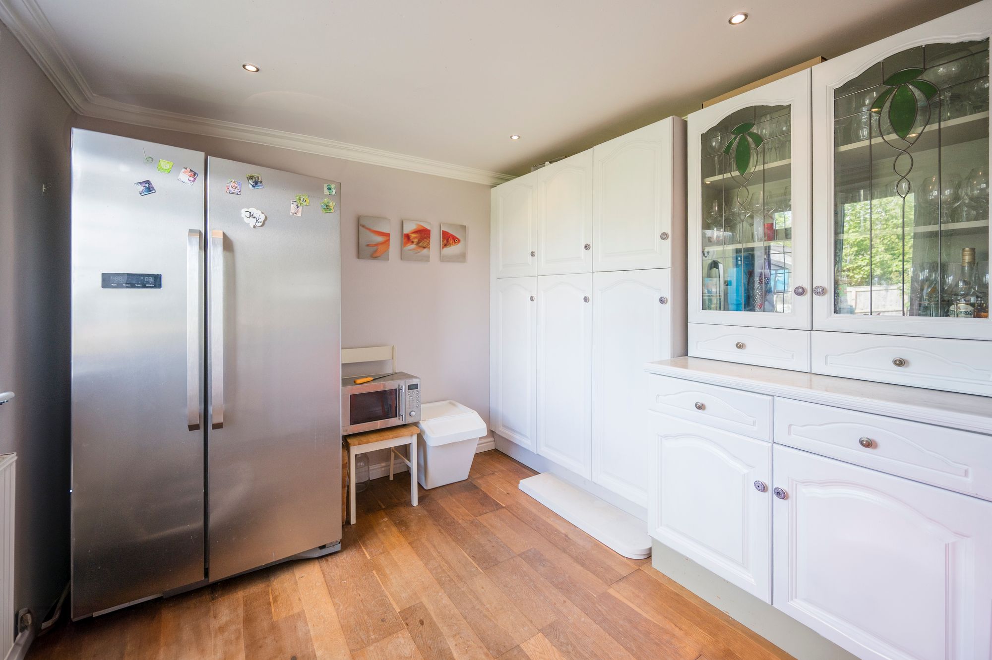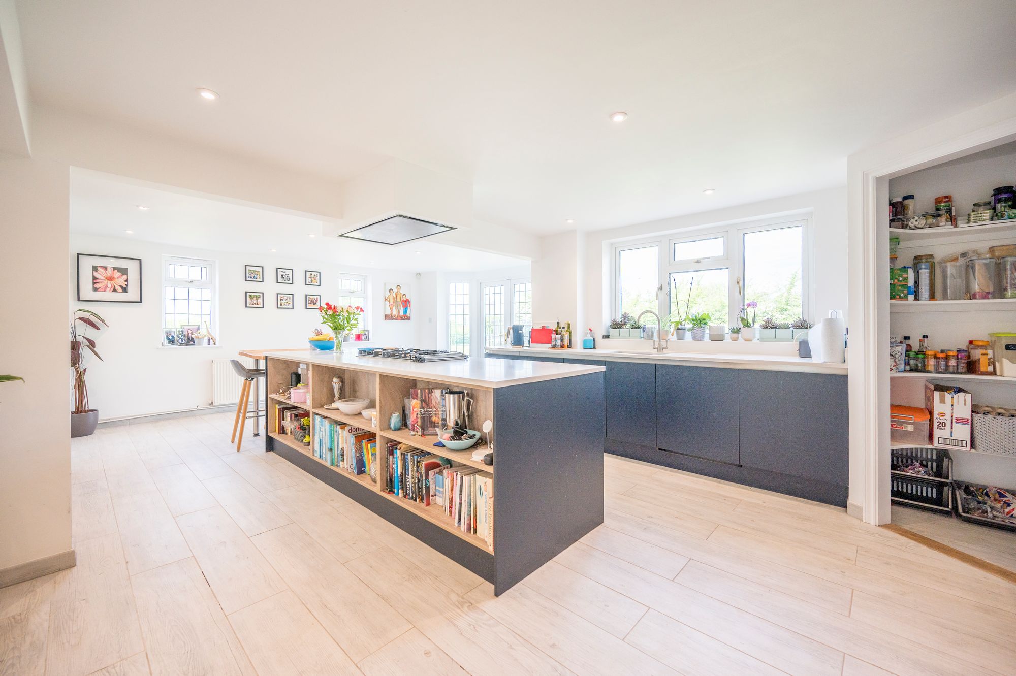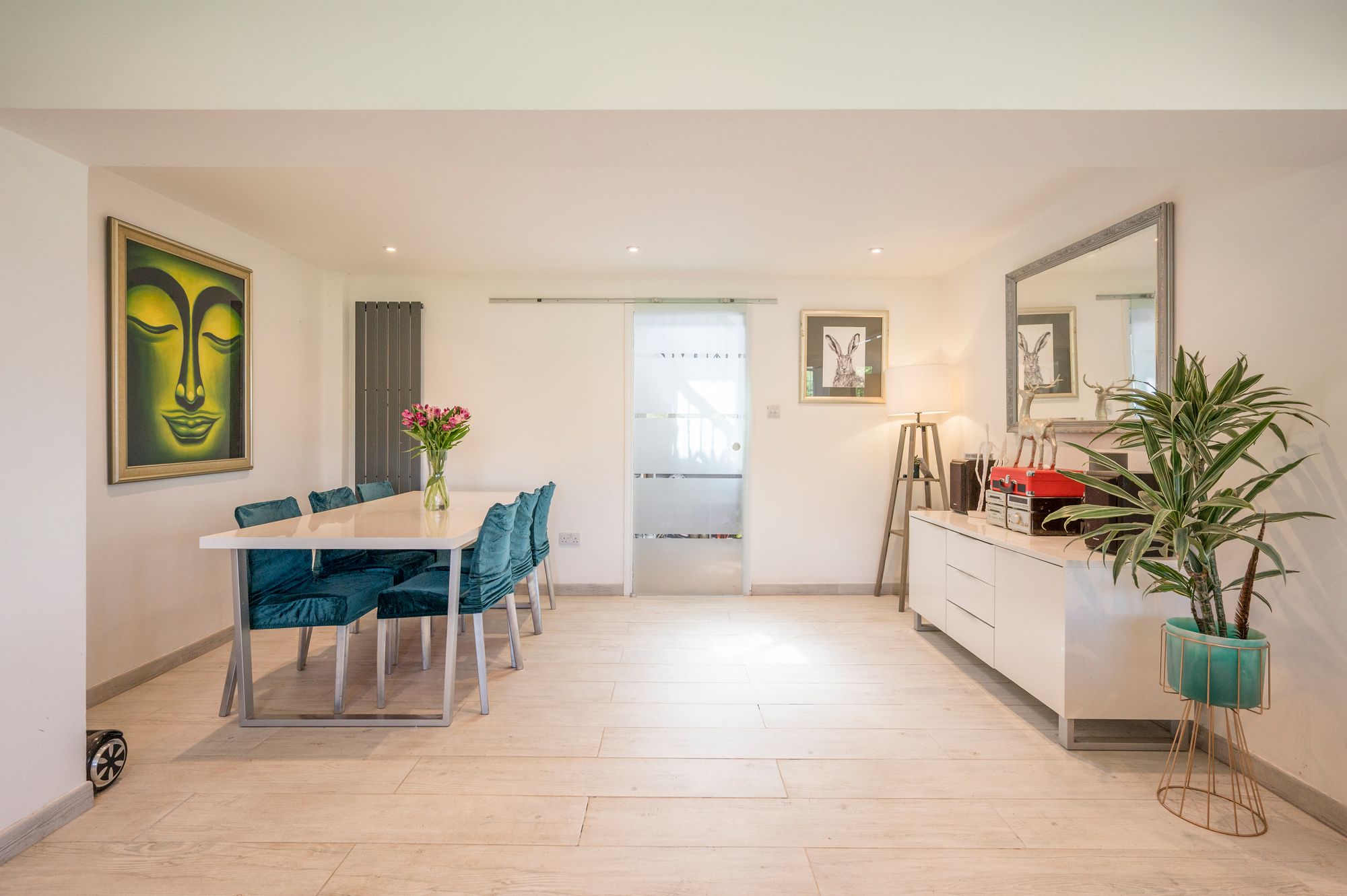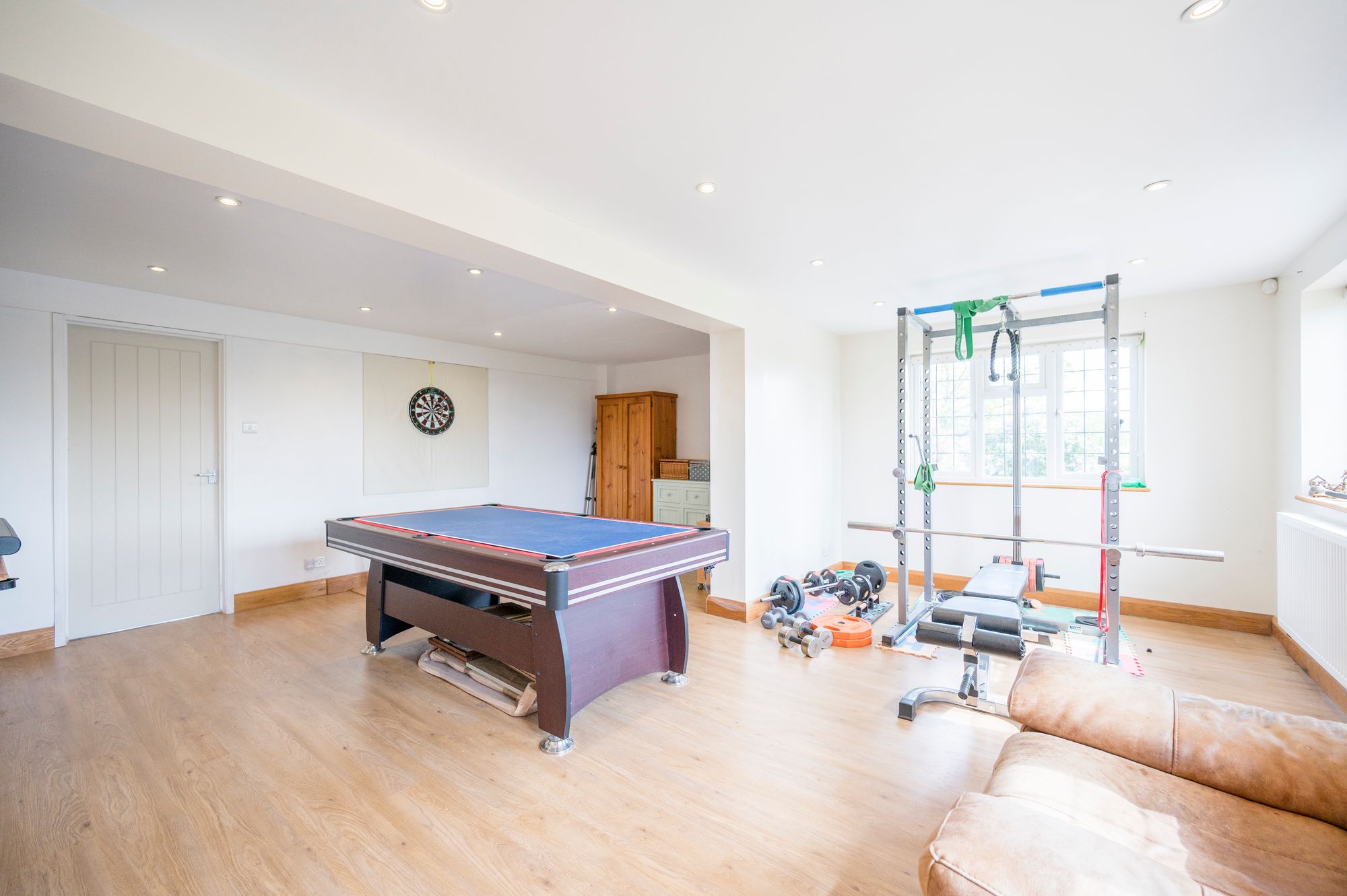 The main door to the front of the house provides access to a reception hall. Off this is a cloakroom with WC, a door to the rear of the property, to the kitchen, and also to an extensive reception room which is currently used as a playroom/gym. Off this is a ground floor large double bedroom that has French door opening to the rear garden and a door into a bathroom with bath, shower, WC and hand wash basin. The house has a most impressive open plan and spacious kitchen/dining room which enjoys views from windows and French doors over the gardens. It is fitted with a modern range of high and low level wall units that include an integrated dishwasher, two electric ovens and space for a fridge/freezer. There is a kitchen island with five ring gas hob. The room has recessed spotlighting and tiled flooring in a timber style. Off this is a particularly useful and large larder and pantry. Doors lead to a front hallway, the sitting room and also to the utility room. This has high and low level wall units, space and plumbing for a washing machine and off this, is a second ground floor cloakroom with WC. The front hallway has stairs to the first floor landing, a door to a snug or study and a further door to the particularly spacious sitting room. This is triple aspect with windows and French doors overlooking the gardens. There is a fireplace with woodburning stove and exposed floorboards.