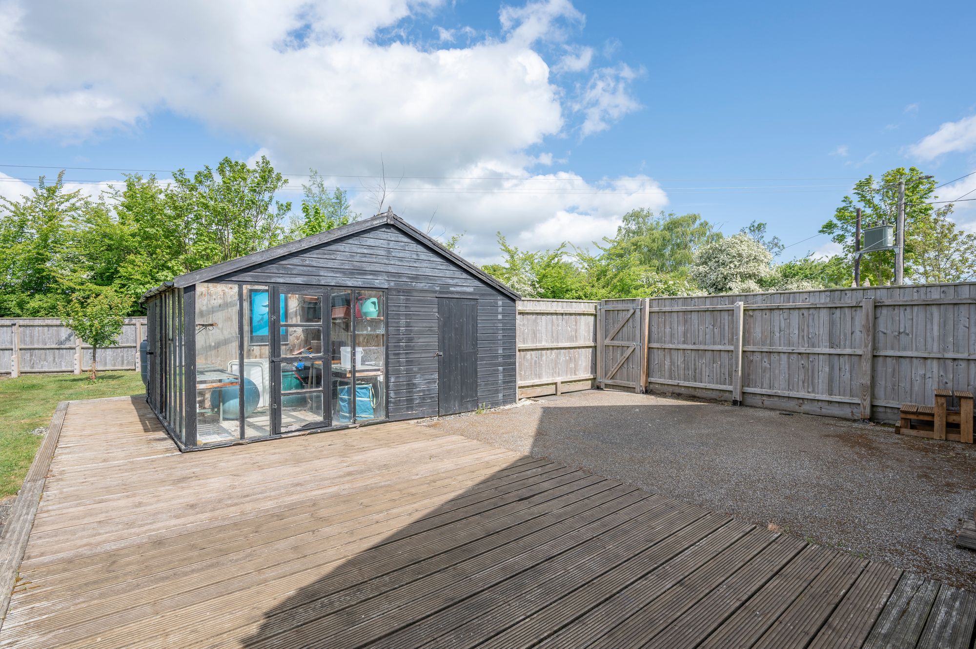 The property has two access points off the lane which leads to a substantial tarmac parking area for ample vehicles. Adjacent to this is a store shed, part of which is a greenhouse. There are gardens to the front of the house to the south-east, and the gardens wrap around the house to the side and rear being to the south-west and north-west. These are laid to grass and contain young trees. There is a fenced off area with former stables and a shed. Decking wraps around the side and rear of the house. In all, the grounds extend to approximately 1.25 acres.