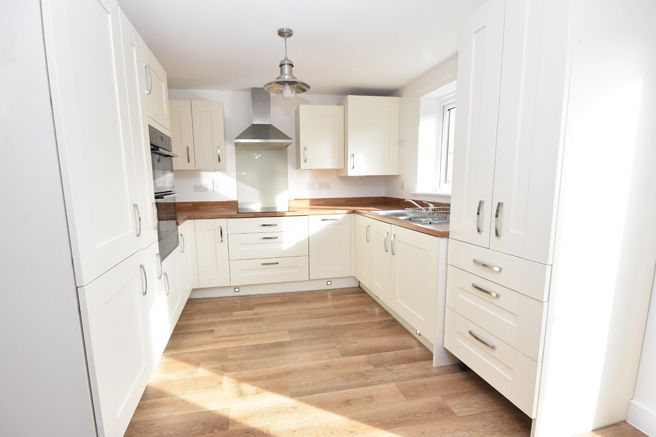 Fully fitted with cream shaker style high and low level units with cupboards and drawers under roll edge work surfaces. One and a half bowl stainless steel sink and drainer with h&c mixer over. Built-in eye level double oven, inset Smeg ceramic hob with stainless steel chimney style filter system above. Dishwasher, washing machine, freezer and fridge. Pull out larder, contemporary radiator, wood laminate floor.