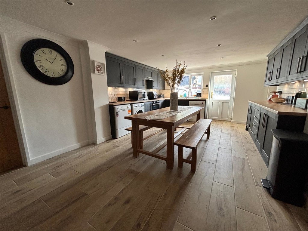 Double glazed window to rear, range of wall and base units, tiled floor, integrated oven, hob and extractor, sink and drainer with mixer tap, wooden worktops, tiled splash backs, spotlights, space for appliances and door to outside.